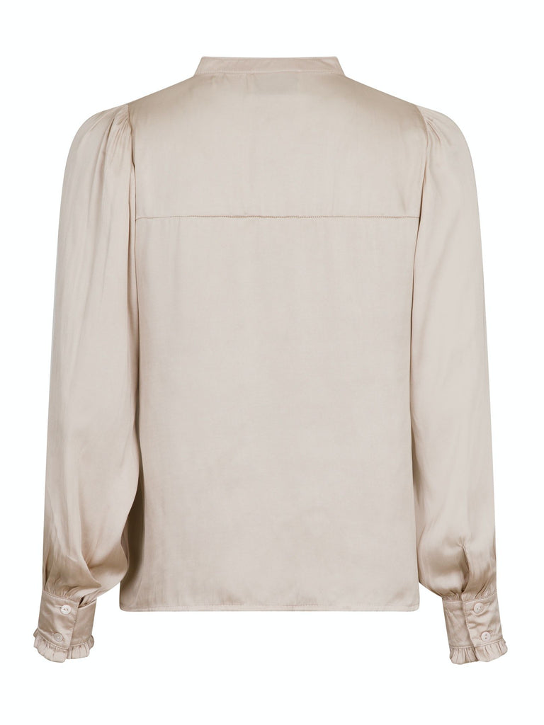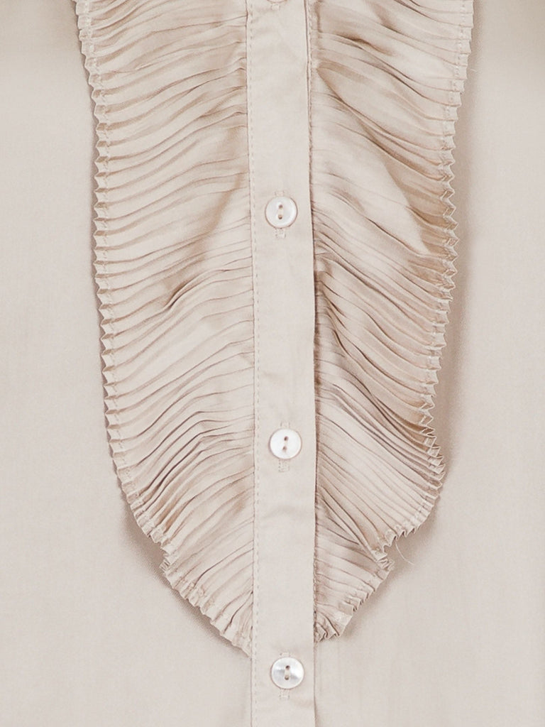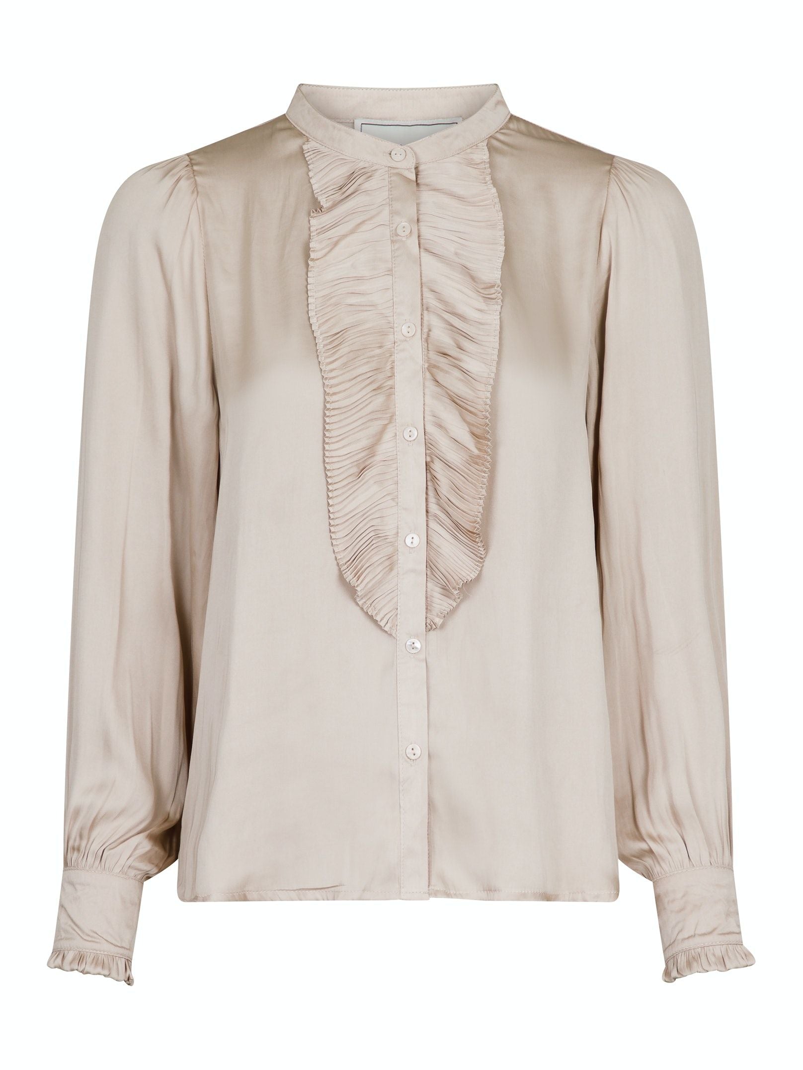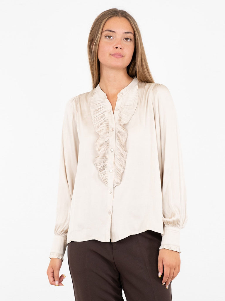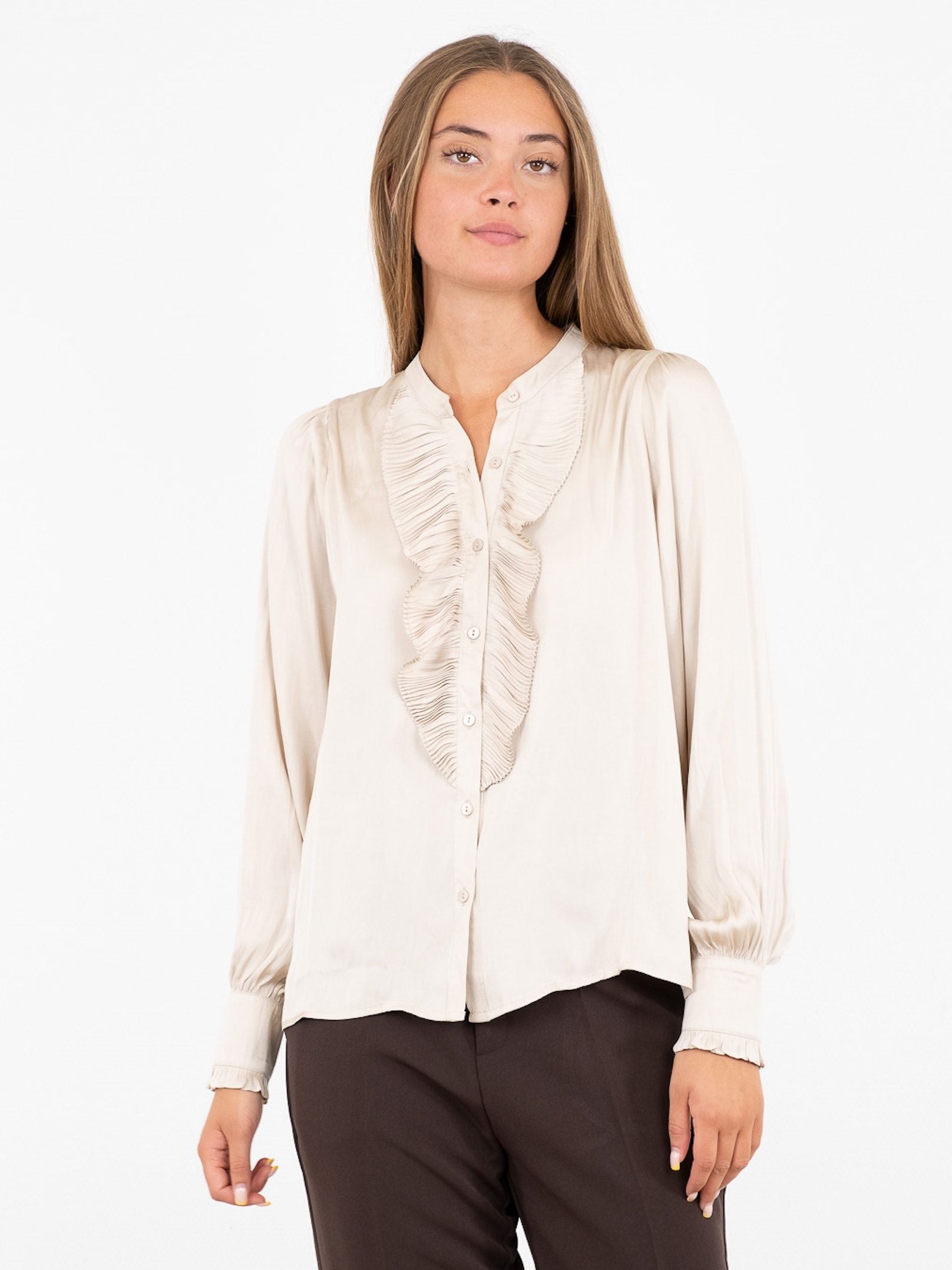 Smuk bluse med flæser med plissé detaljer. Pasformen er løs og kommer i en lækker blød satin kvalitet.