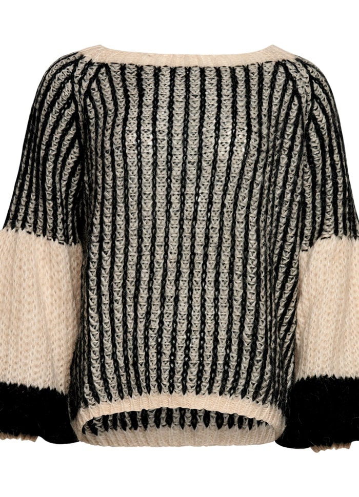 Lækker strik fra Noella i creme og sort. Strikken kommer i en oversize pasform med ballonærmer.