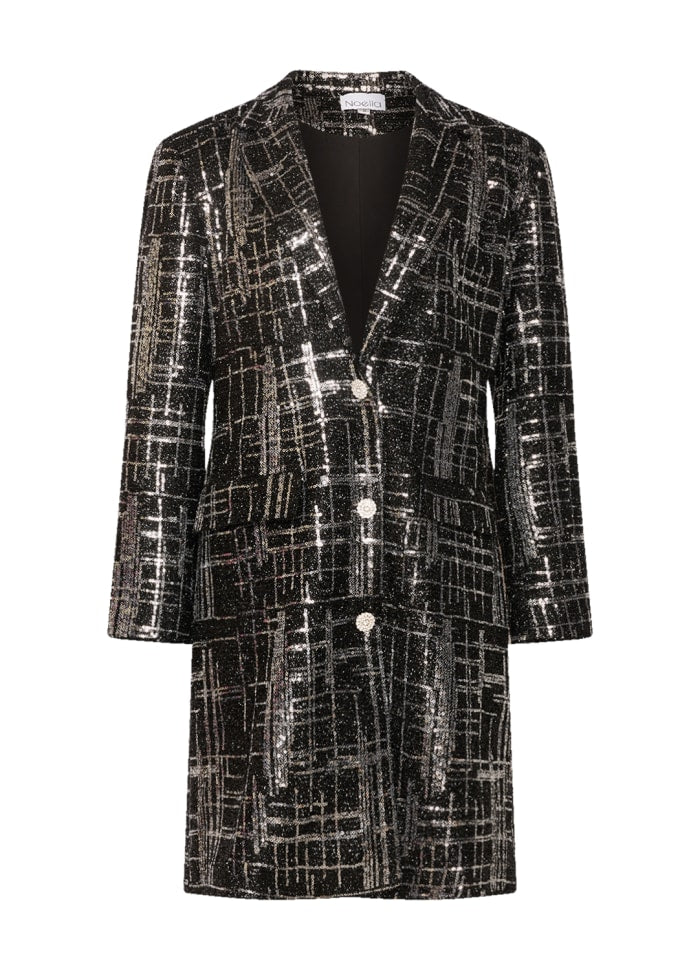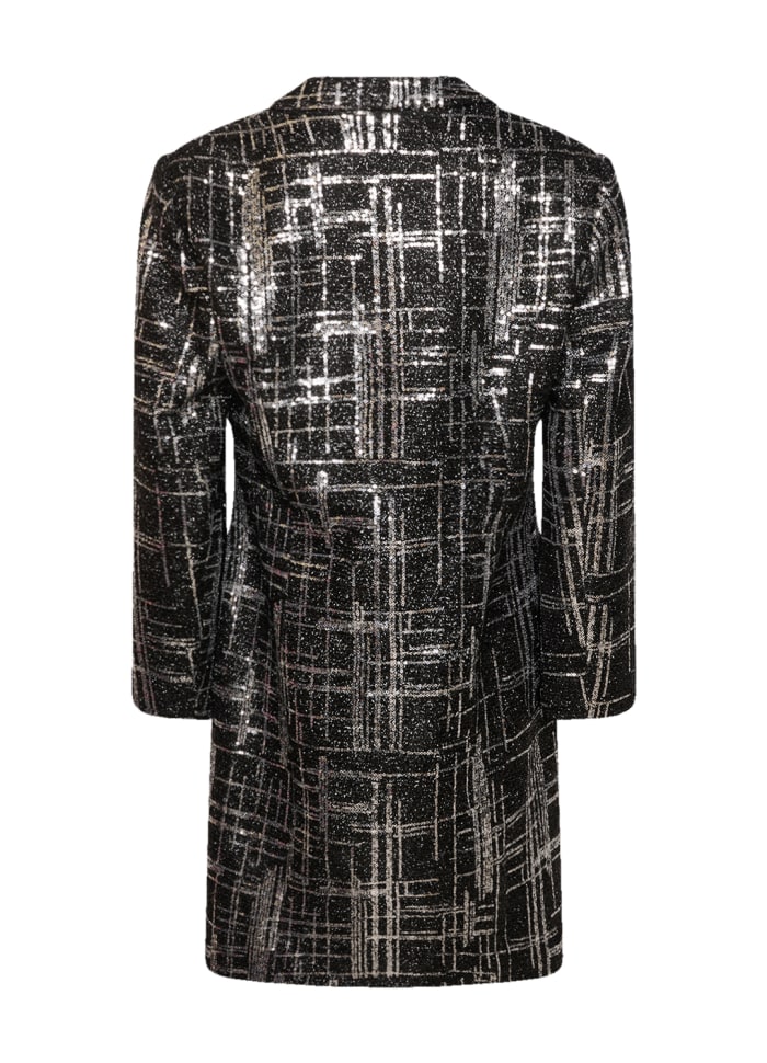 Fedeste blazerkjole fra Noella i sort og sølv palietter. Kjolen har en løs pasform og lukkes fortil med knapper med flotte similisten. Kjolen har skulderpuder og kan sagtens bruges åbenstående som blazer.