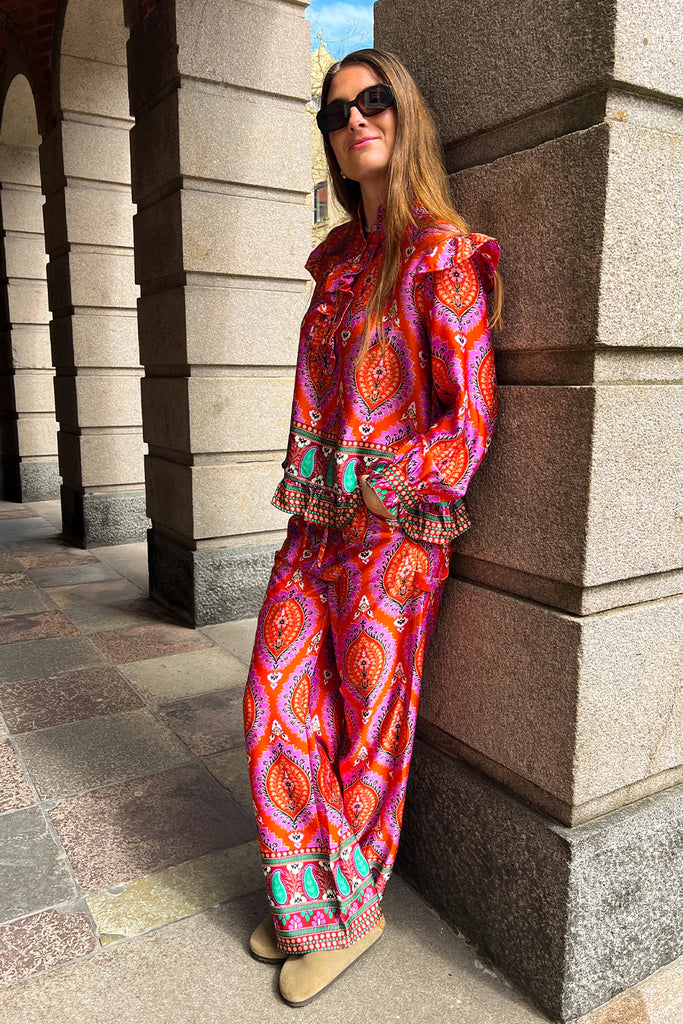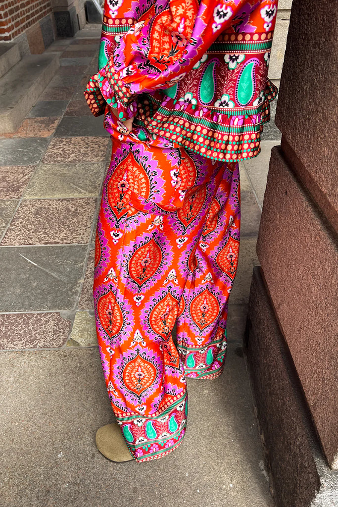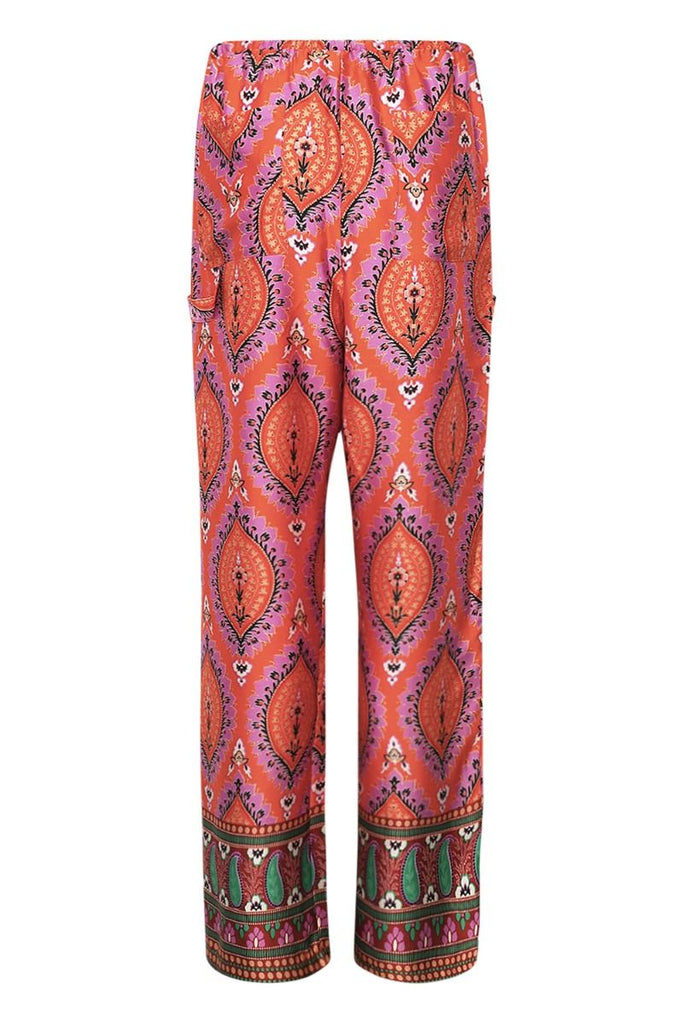 Et par smukke bukser fra Noella i et sejt orange print. Den er i en let kvalitet med satin look. De er med vide i benene og elastik i taljen som markeres med en lille sløjfe foran. Derudover er der en matchende bluse til så du nemt kan lave et sæt.