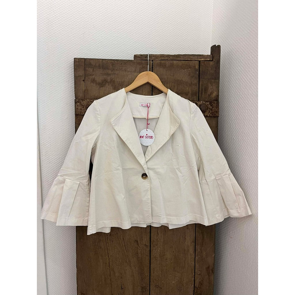 Smuk og let jakke i bomuld med elastane. Med 3/4 ærme afsluttet med flæse og flæse bagpå. Lukkes med en enkelt knap foran.