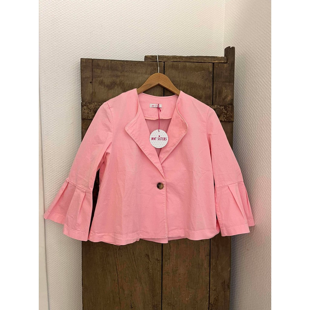 Smuk og let jakke i bomuld med elastane. Med 3/4 ærme afsluttet med flæse og flæse bagpå. Lukkes med en enkelt knap foran.