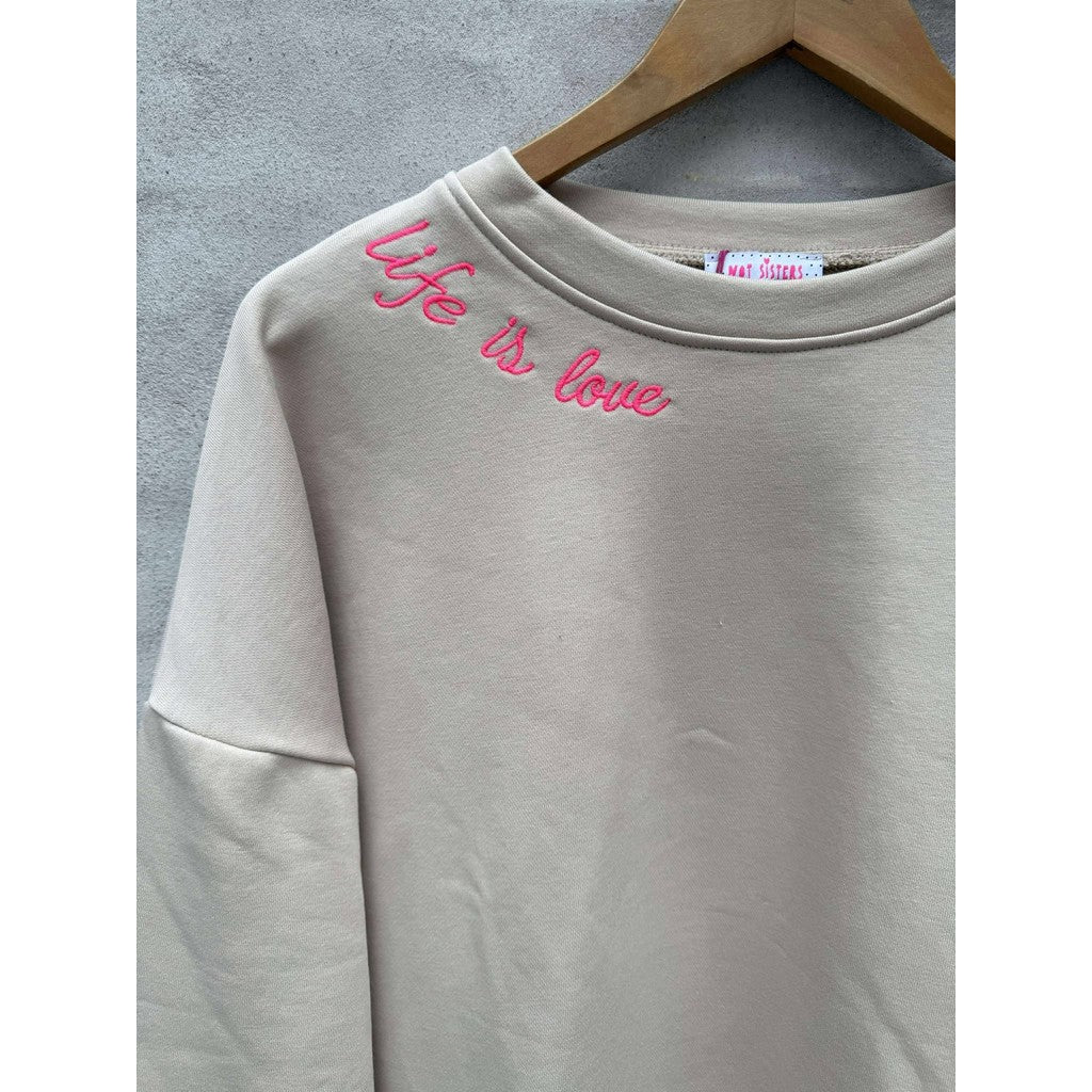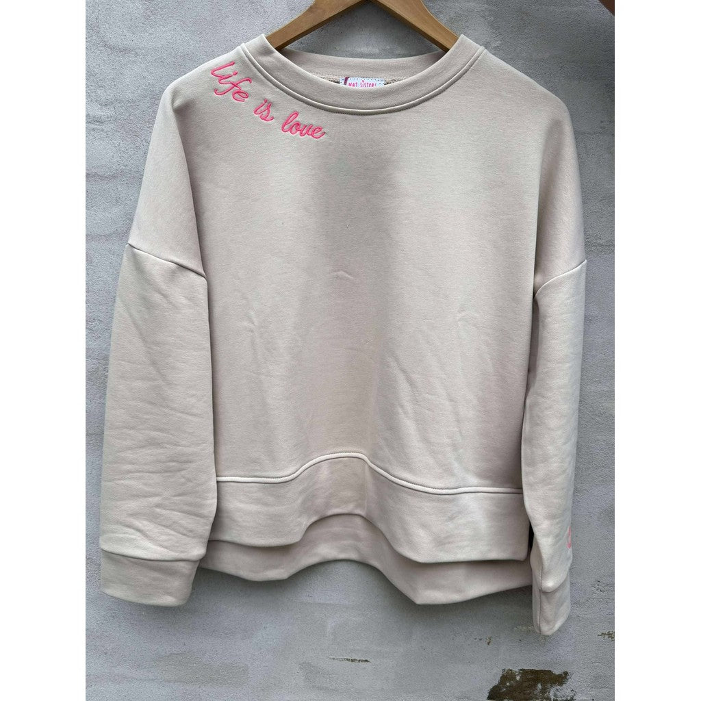 Super cool sweatshirt i Beige med pink broderet skrift. Med rund hals og fin slids forneden. Lidt længere bagpå end foran.
