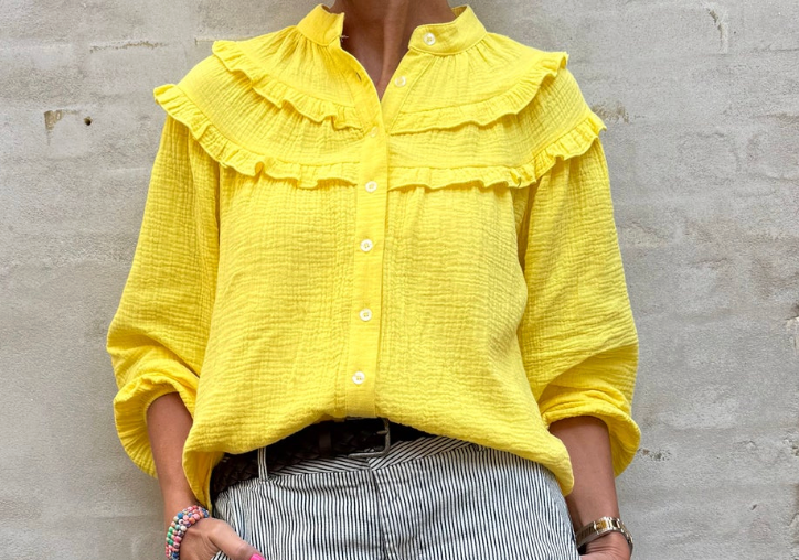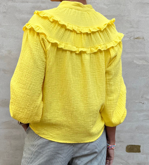 Sunshine Shirt fra Not Sisters er en feminin og elegant skjorte, der kombinerer et let og romantisk udtryk med smukke, gennemtænkte detaljer. Den varme gule farve giver et friskt og tidløst look, som gør skjorten nem at bruge både til hverdag og mere pæne anledninger.