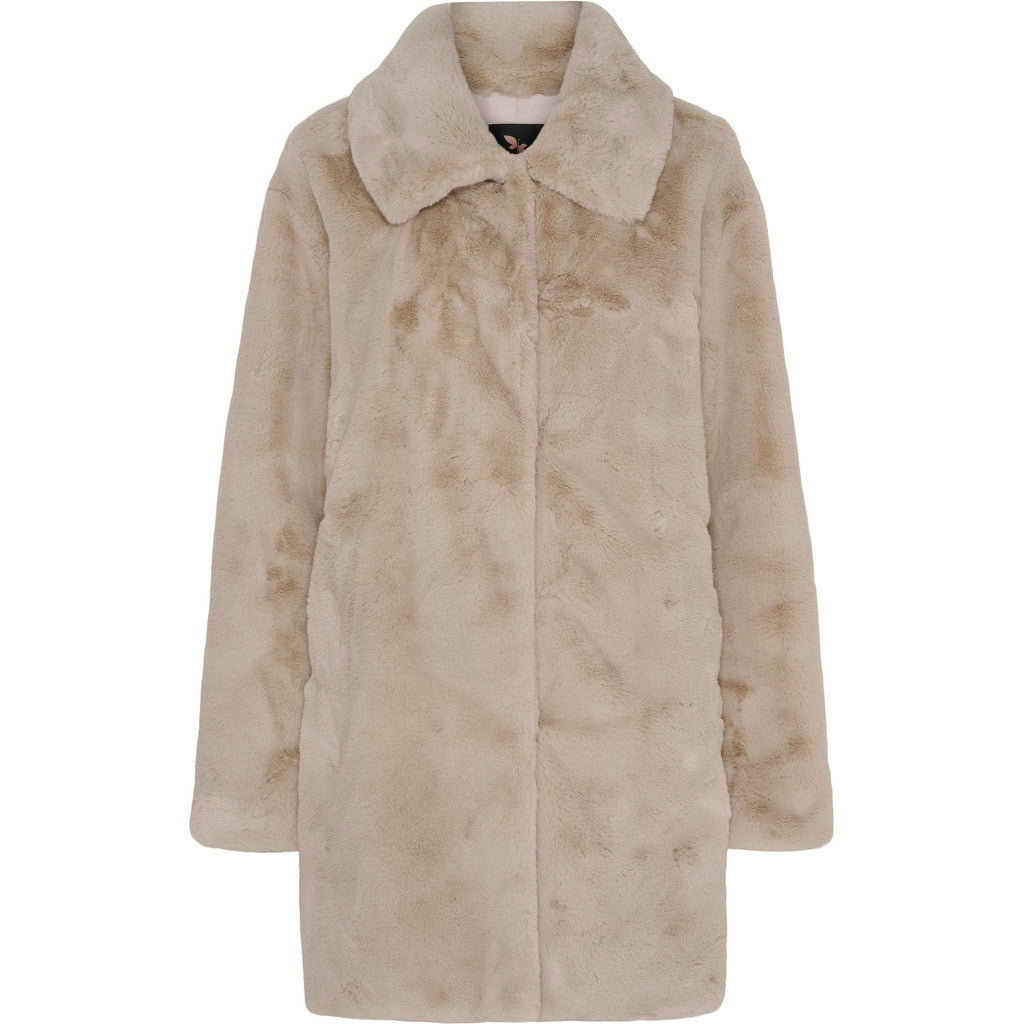 Trendy jakke i fake pels, designet med en klassisk krave og sidelommer. Jakken lukkes med skjulte knapper ned foran. Uanset om du ønsker at tilføje et råt touch til dine outfits eller fremhæve en feminin stil, er denne jakke det ideelle valg.