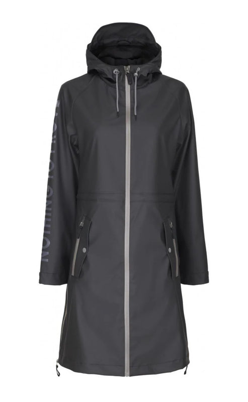Lang regnjakke med hætte og med vandtæt lynlåslukning langs fronten. Regnjakken har mange funktionelle detaljer i form af justerbare manchetter for enden af ærmerne, samt den kan spændes ind både ved hætten og i livet. Har lynlås forneden i hver side for ekstra vidde. To sidelommer og to snydelommer.