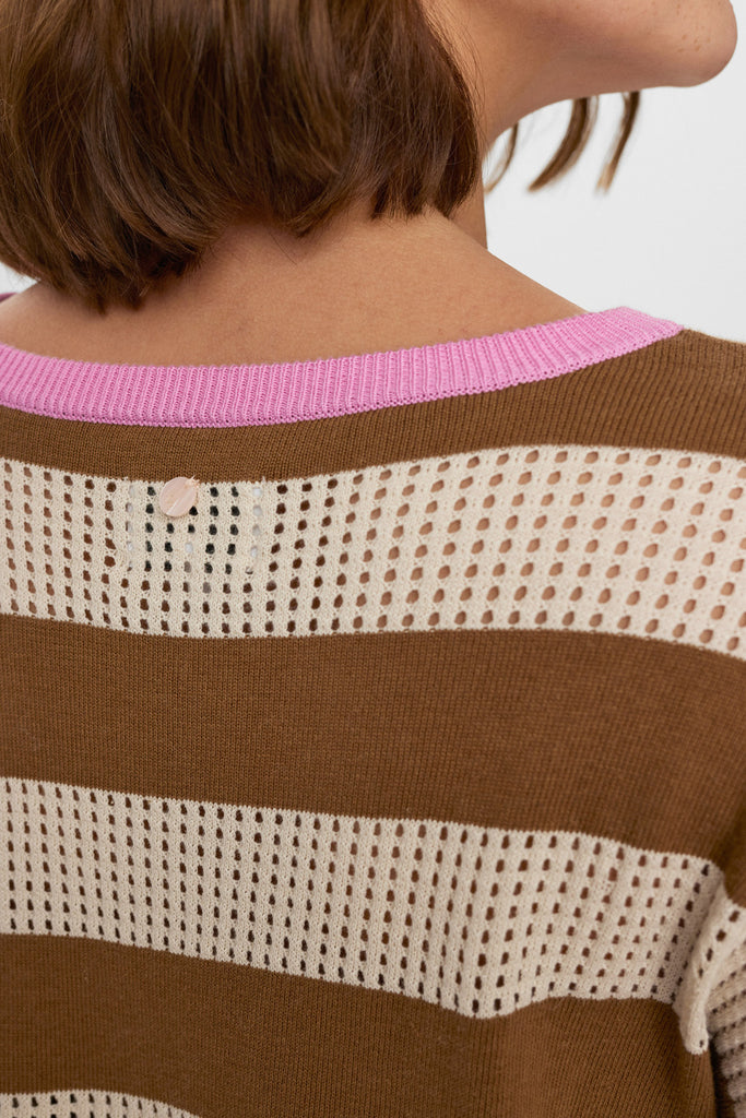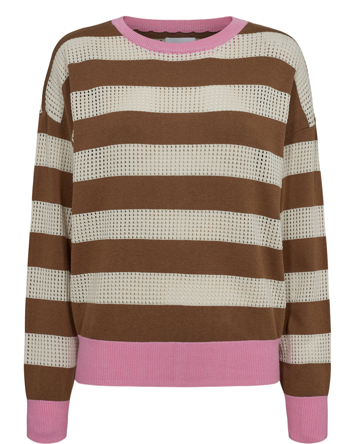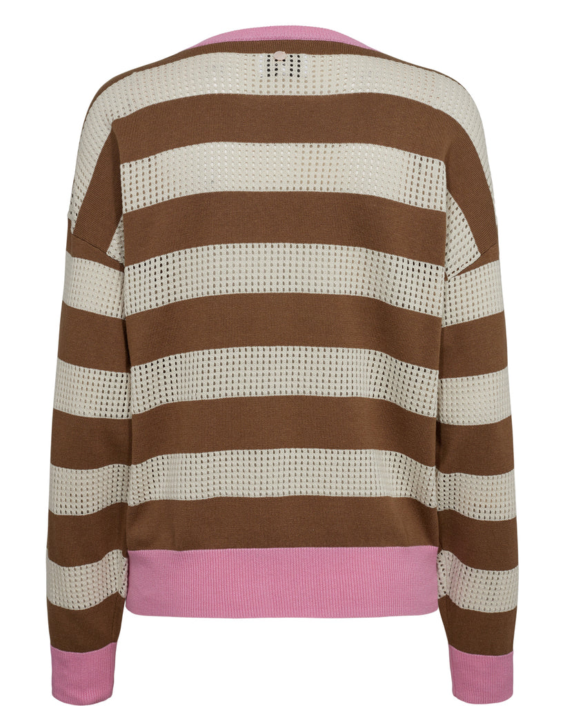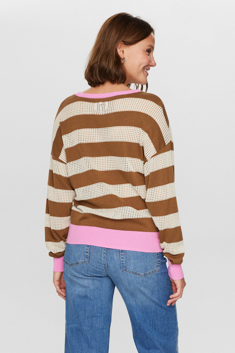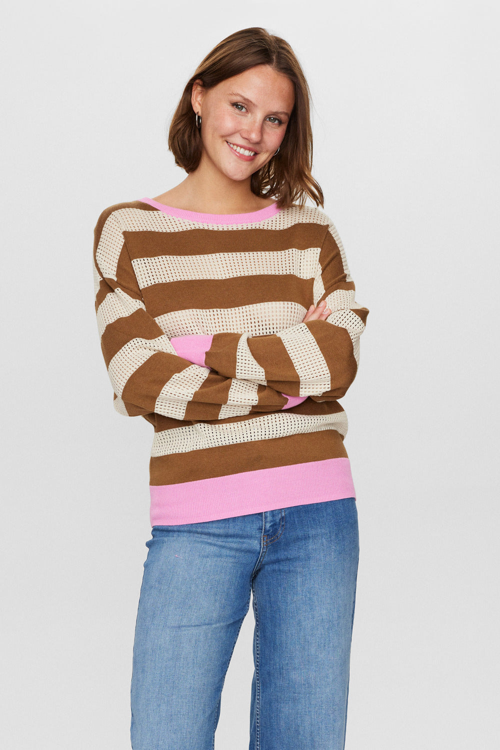 Fin og let strik pullover fra Nümph. Blusen er i off white, brun og pink i forstille teksture, som gør en ellers enkel bluse mere smart.