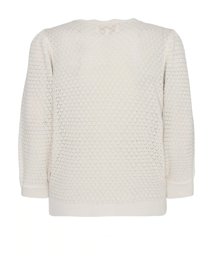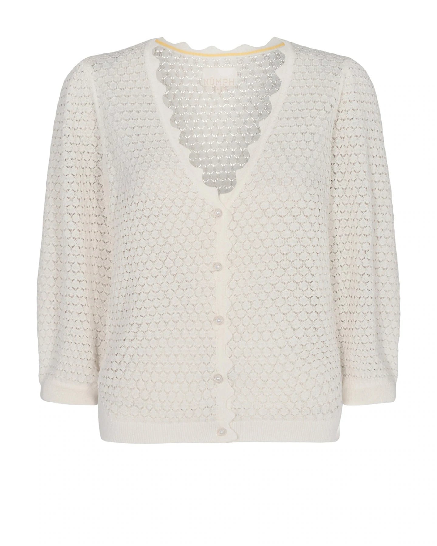 Let strikket cardigan i hvid fra Nümph. Cardiganen har et smukt hullemønster og en feminin halsudskæring. Lukkes fortil med fine knapper.
