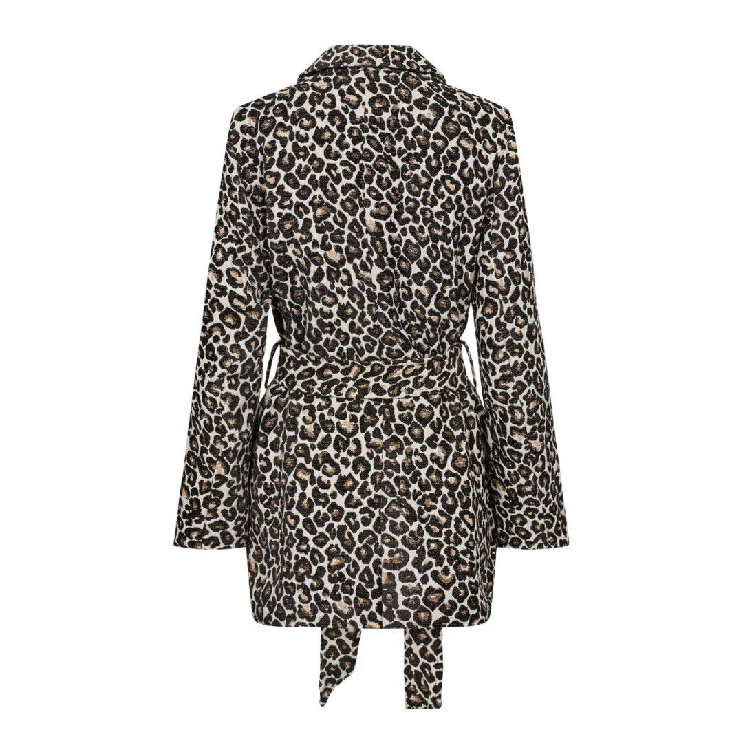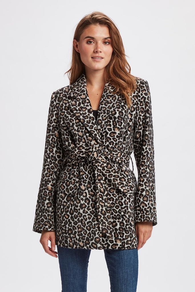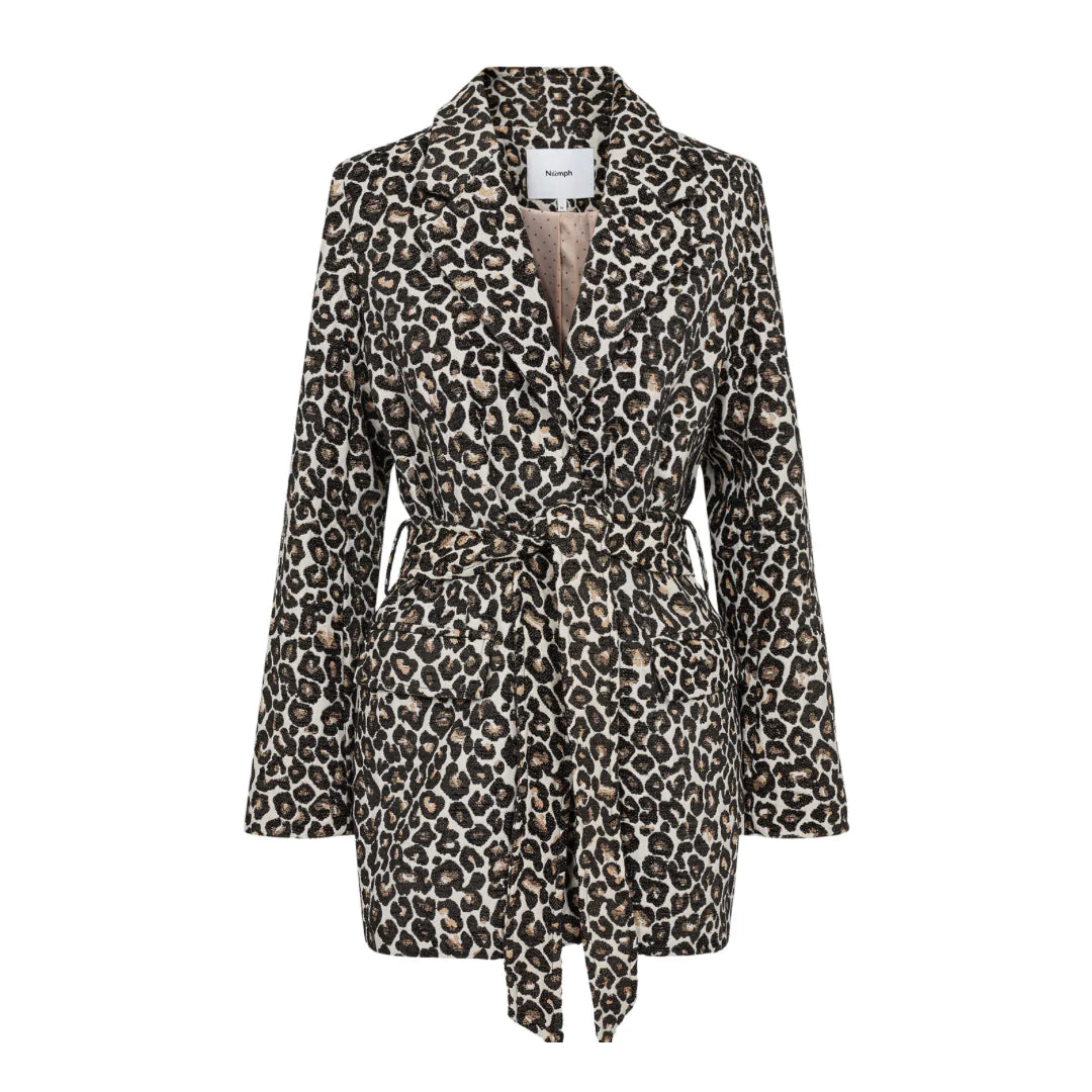Skønneste blazerjakke fra Nümph i leo med prikker på inderforet. Jakken har aftagelig bælte, krave og lukkes fortil med trykknap.