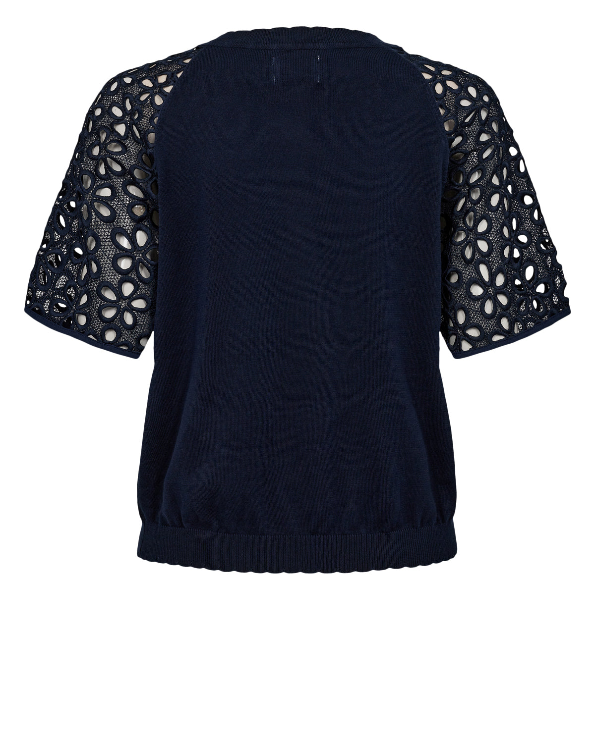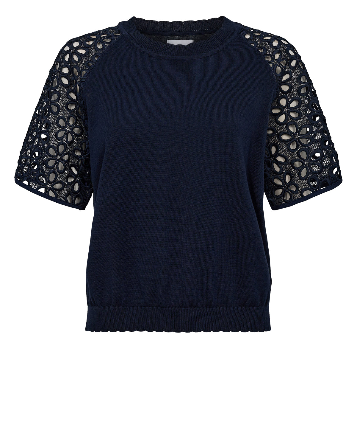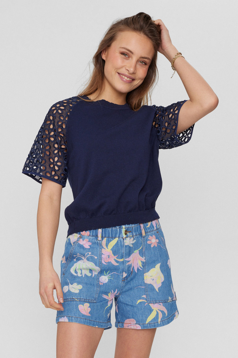 Skønneste strik fra danske Nümph i ren bomuld. Strikken har rund halsudskæring og lille ærmer med de fineste blondedetaljer.