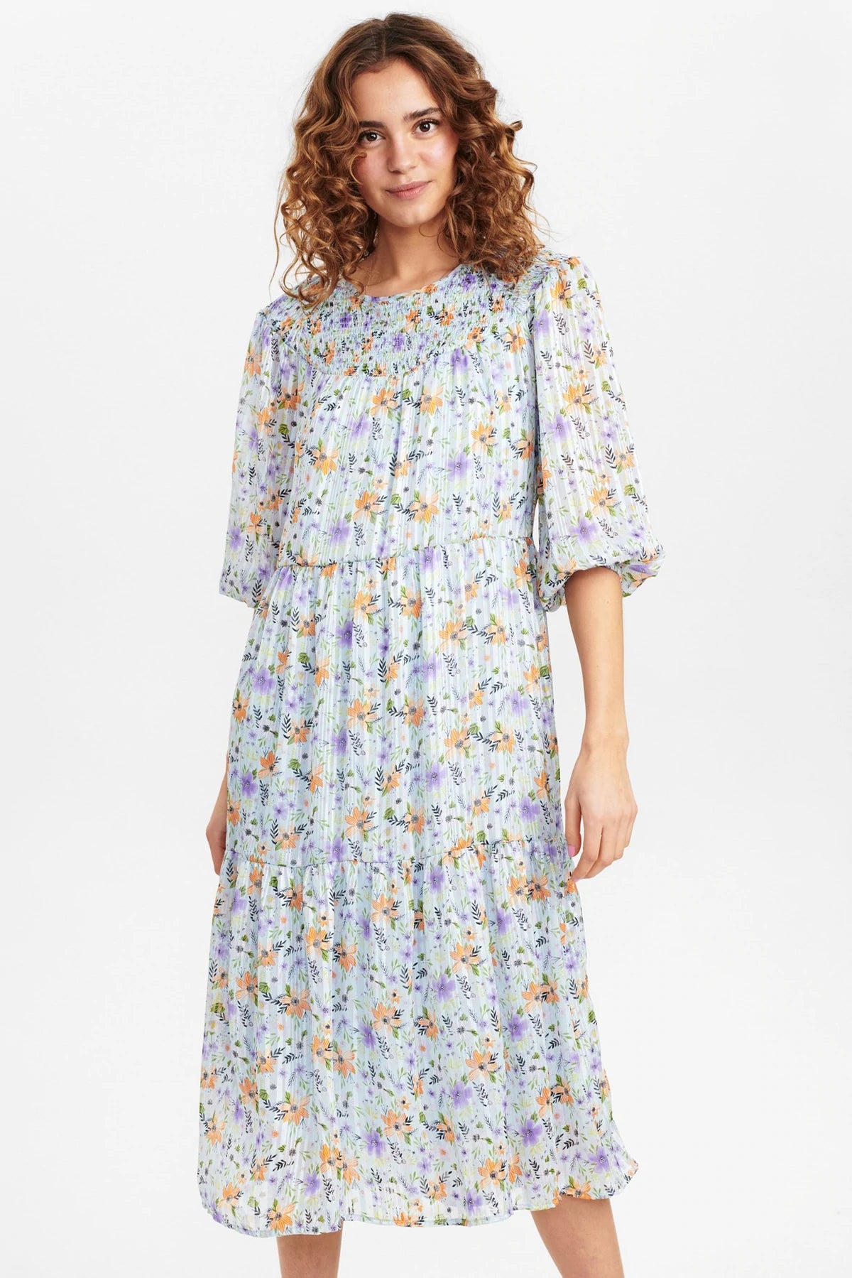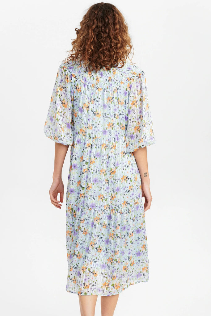 Skøn kjole fra Nümph i en fin lyseblå farve med blomstermønster. Kjolen har 3/4 ærmer med ballon effekt og elastikkant.