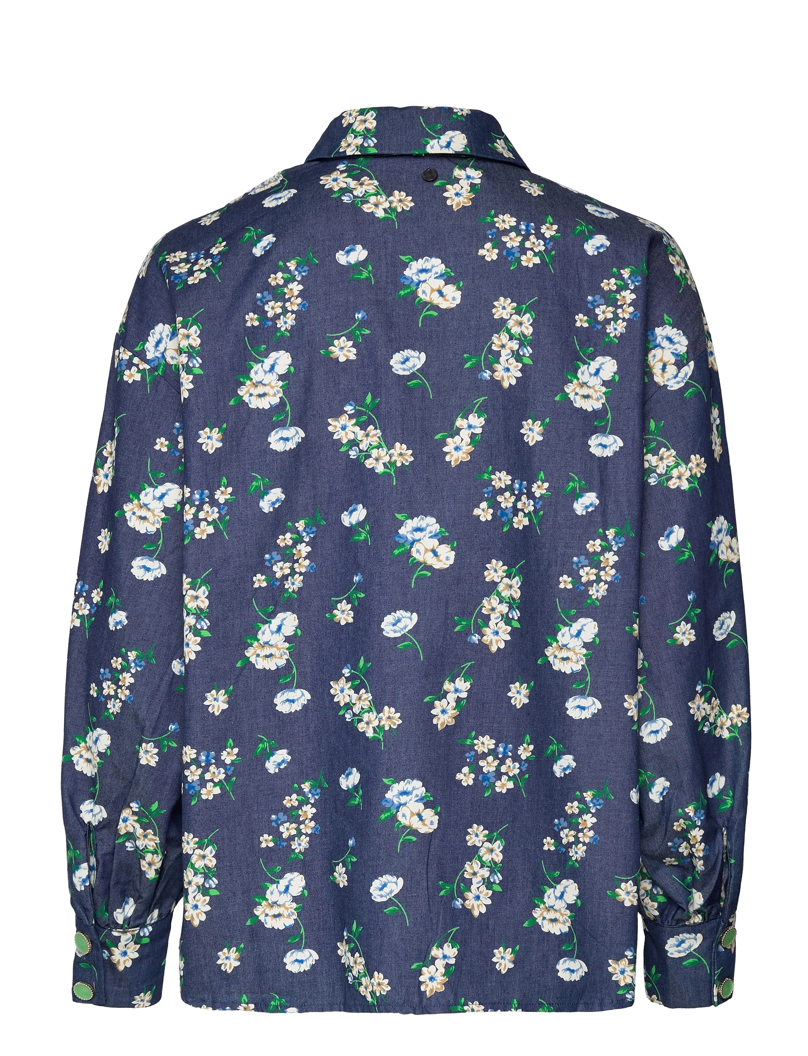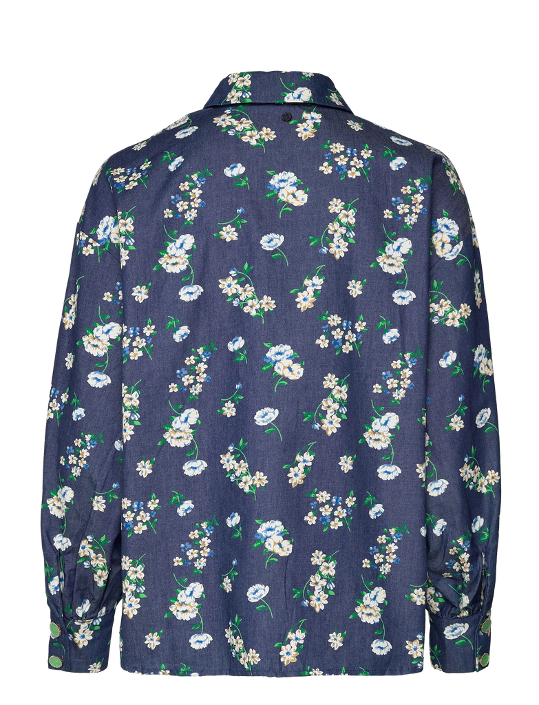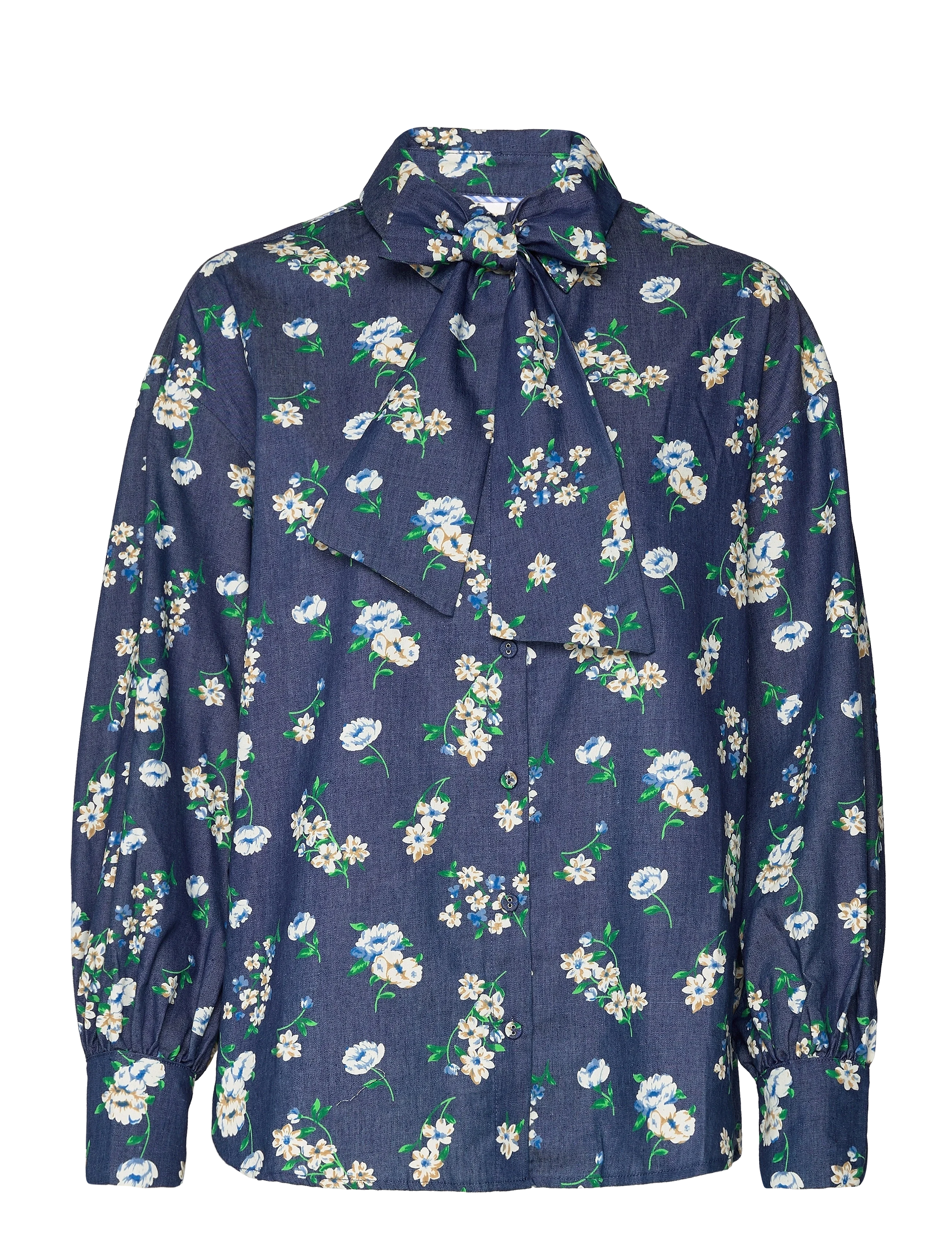 Smuk skjorte fra Nümph med det fineste blomsterprint. Bundfarven er en klassisk denim farve med smukke hvide blomster printet på. Skjorten har de sødeste knapper i mintgrøn som afslutning ved ærmerne og ved halsen. Der er et bånd med som kan sættes rundt om halsen og bindes til en sløjfe og give et feminint udtryk. Men skjorten kan også sagtens bruges uden.