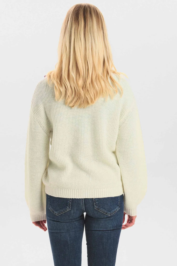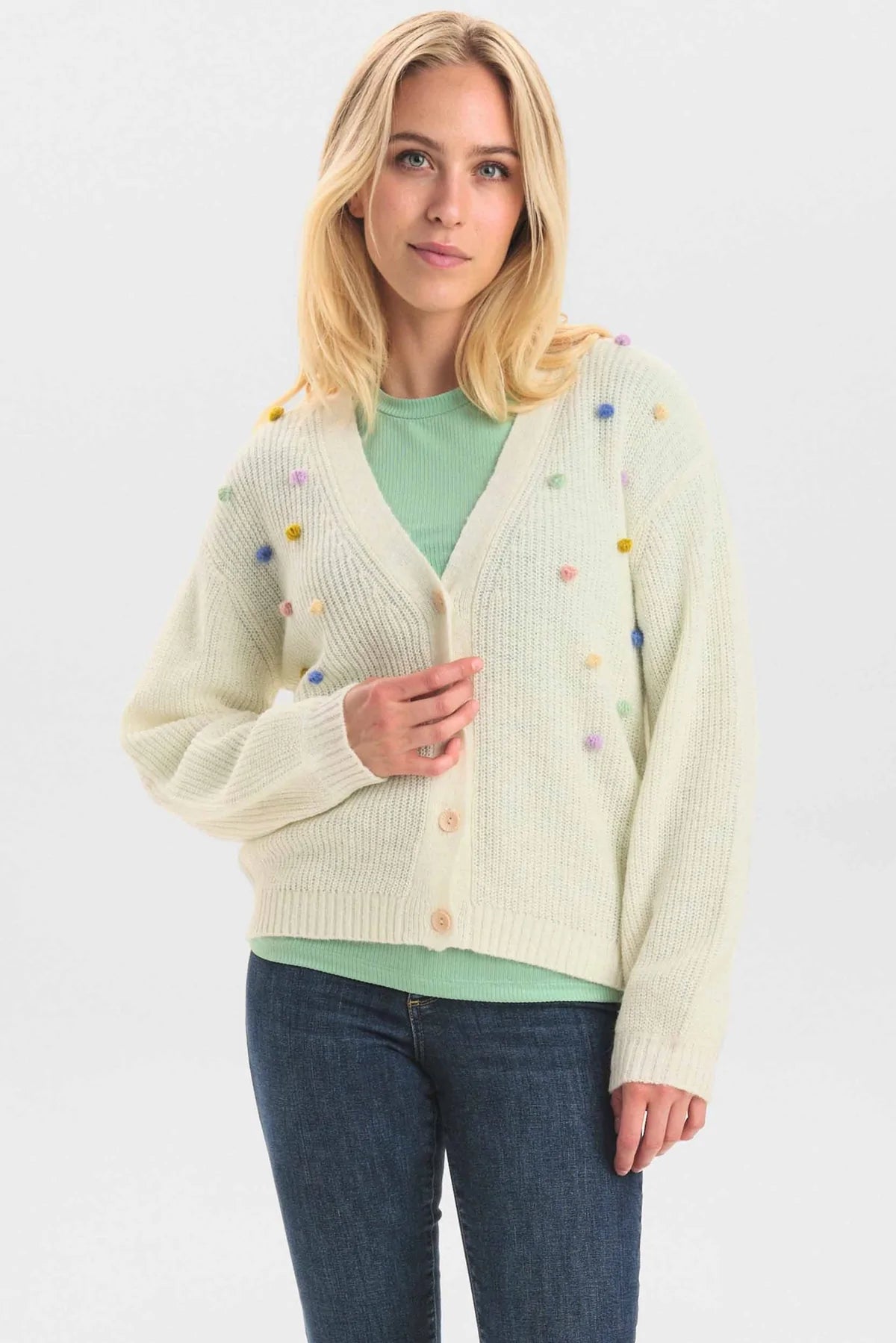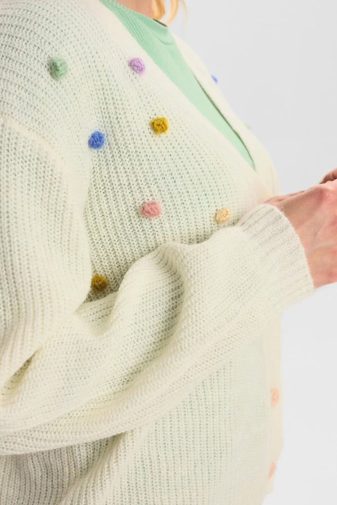 Cool cardigan i off white fra danske Nümph. Cardiganen har små bomber i forskellige farve, er med v-hals og flotte knapper.