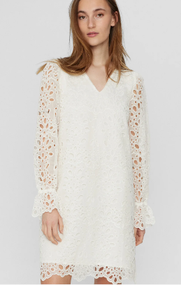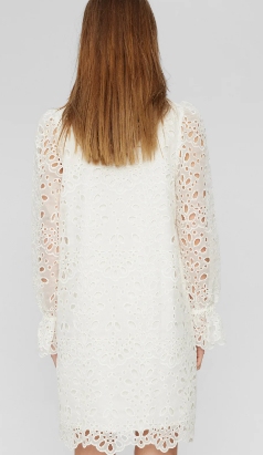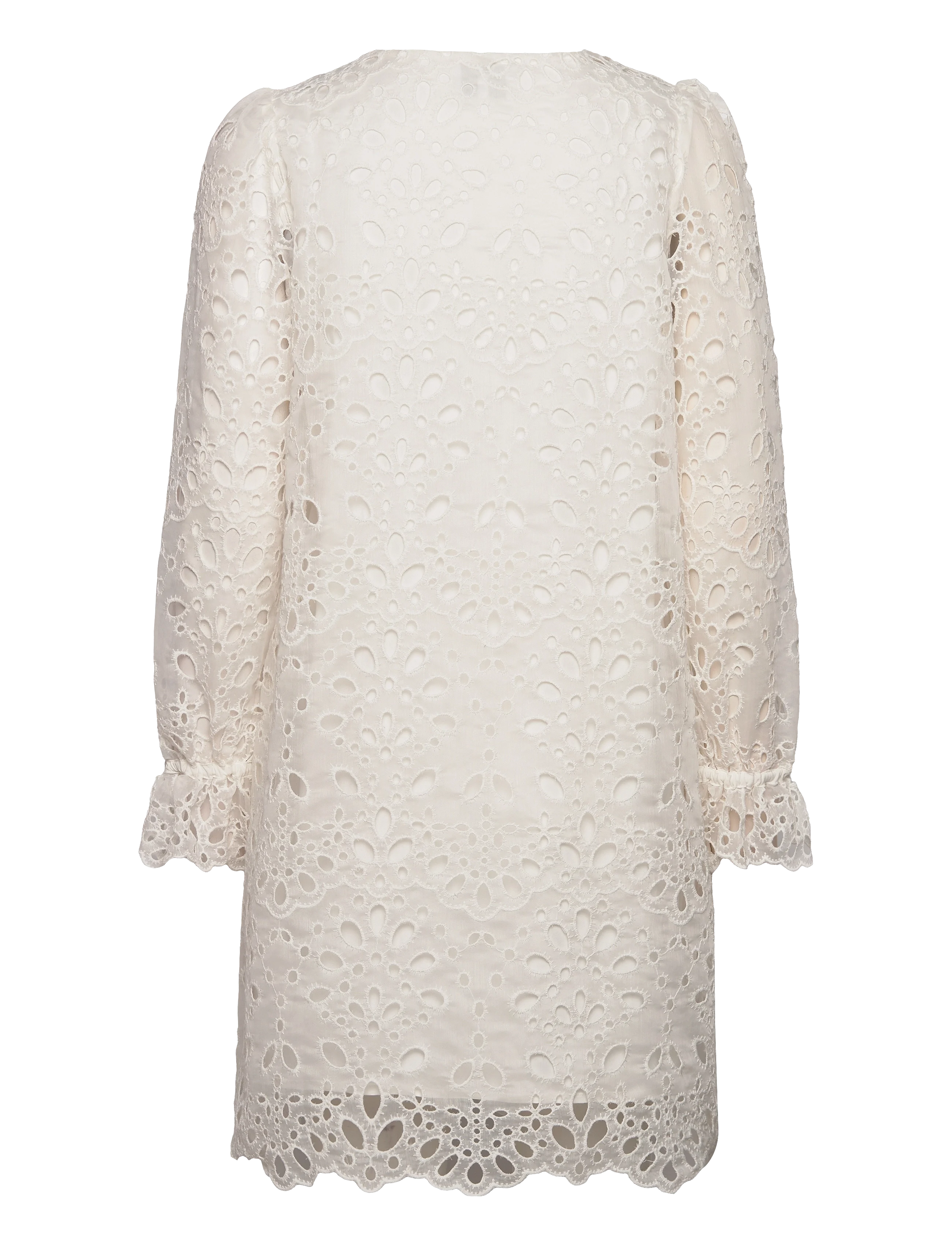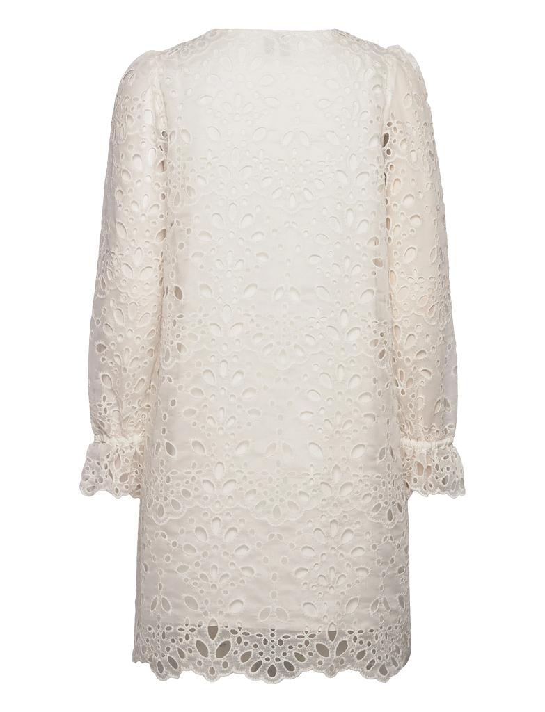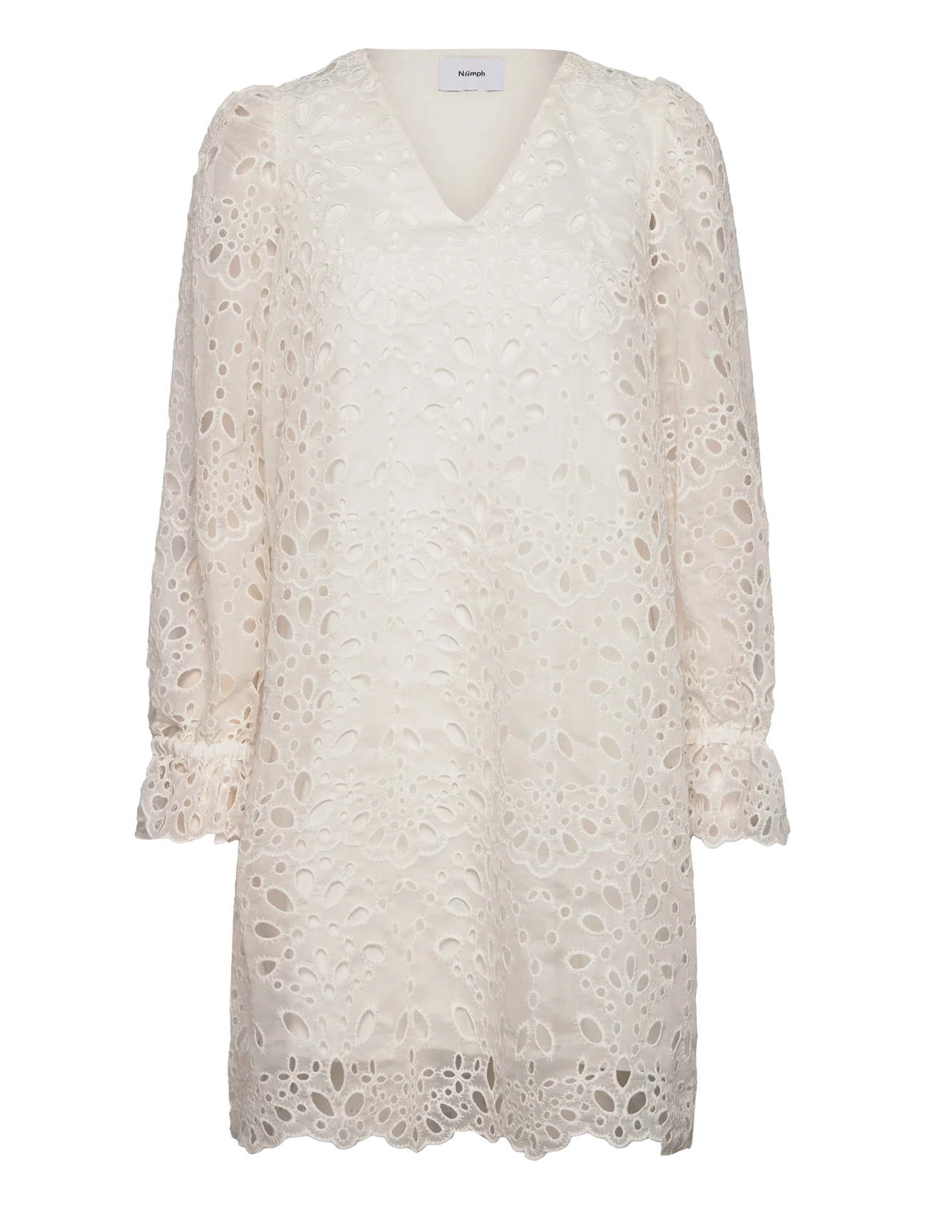 Vildt smuk kjole fra Nümph med det fineste hulmønster i broderi anglaise. Kjolen er gennemsigtig på ærmerne og helt i bunden, men har en underkjole på resten af stykket. Den har v-udskæring og en blød elastik rundt ved håndledet, som giver en fin flæse afslutning.
