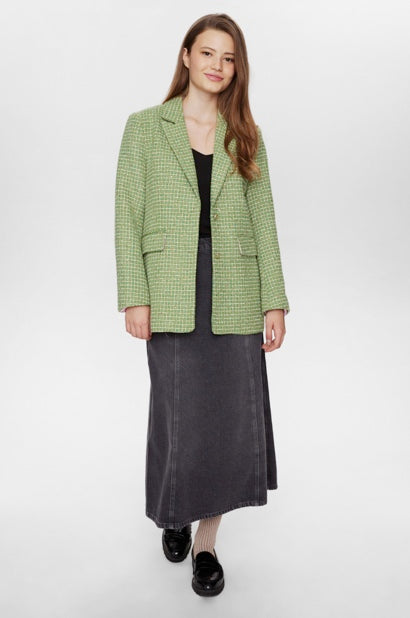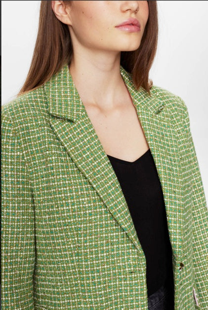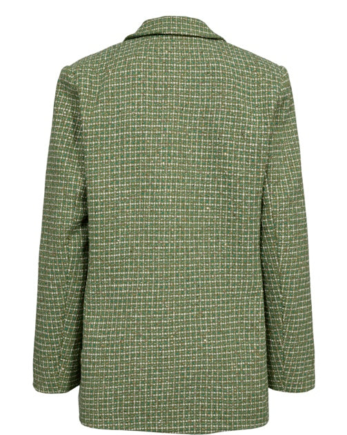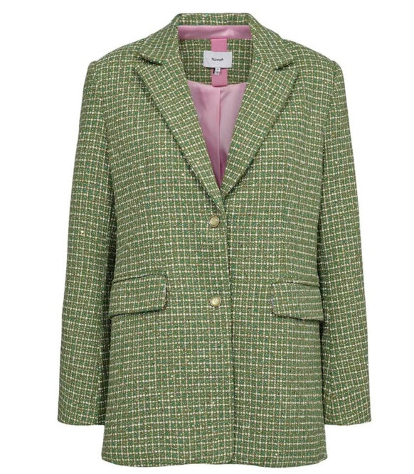 Smuk grøn blazer fra Nümph med guld palietter, den har en lyserød baggrund, 2 små knapper og lommer fortil.
