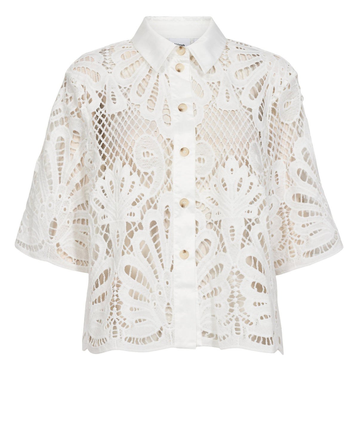 Smuk broderie anglaise bluse med 3/4 ærme, krave og gennemknappet.