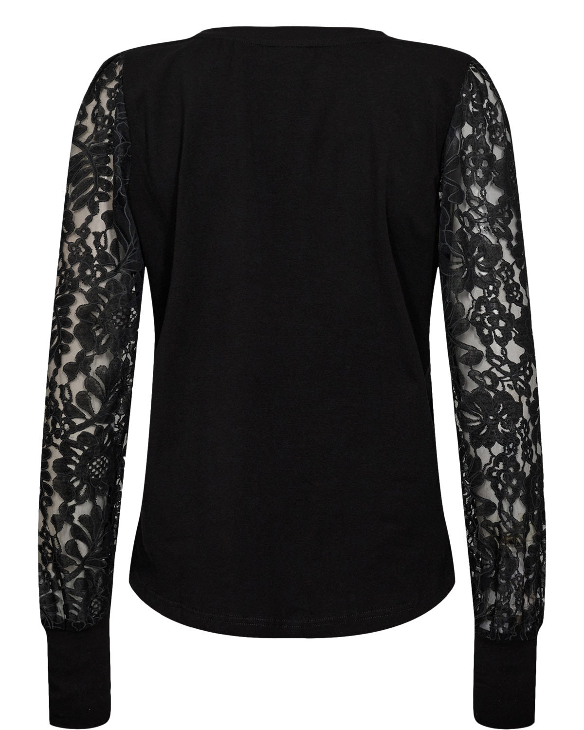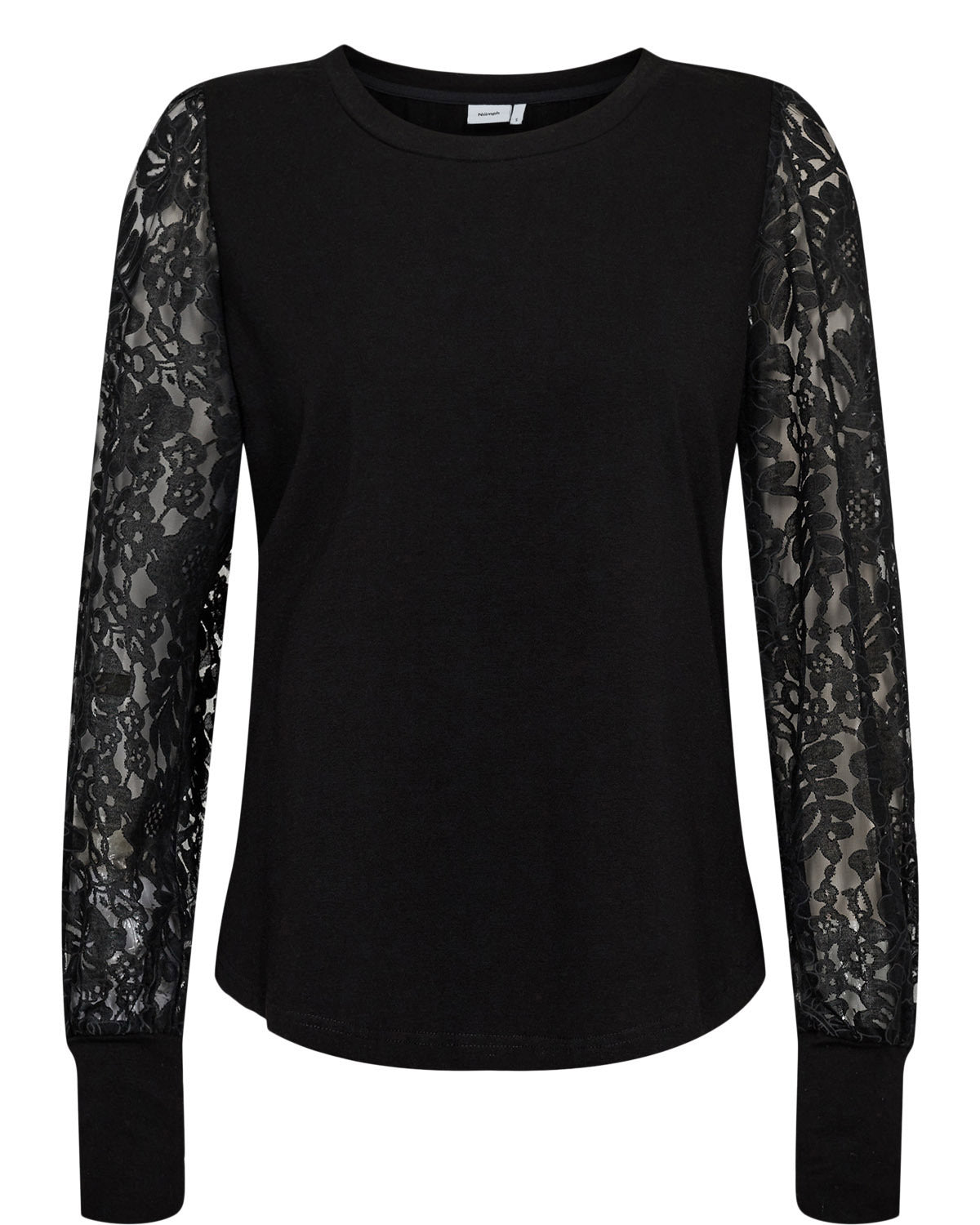 Skøn bluse fra Nümph i en lækker jersey kvalitet. Blusen har rund halsudskæring og flotte blondeærmer.