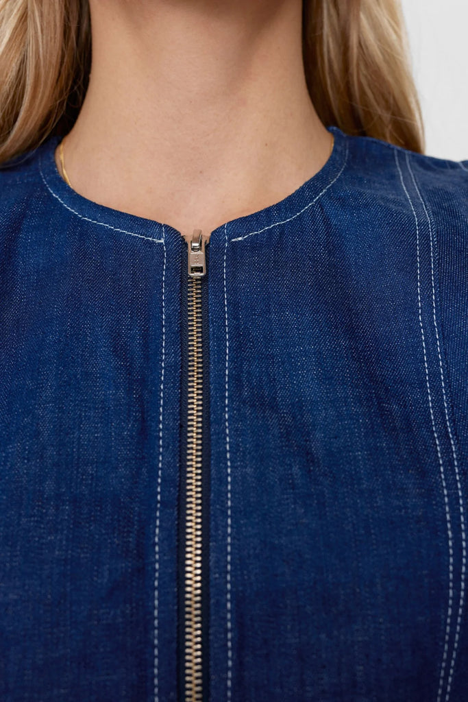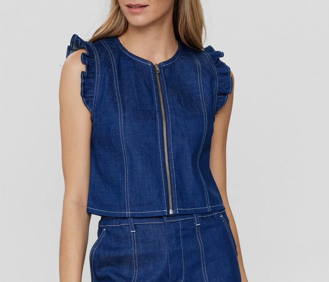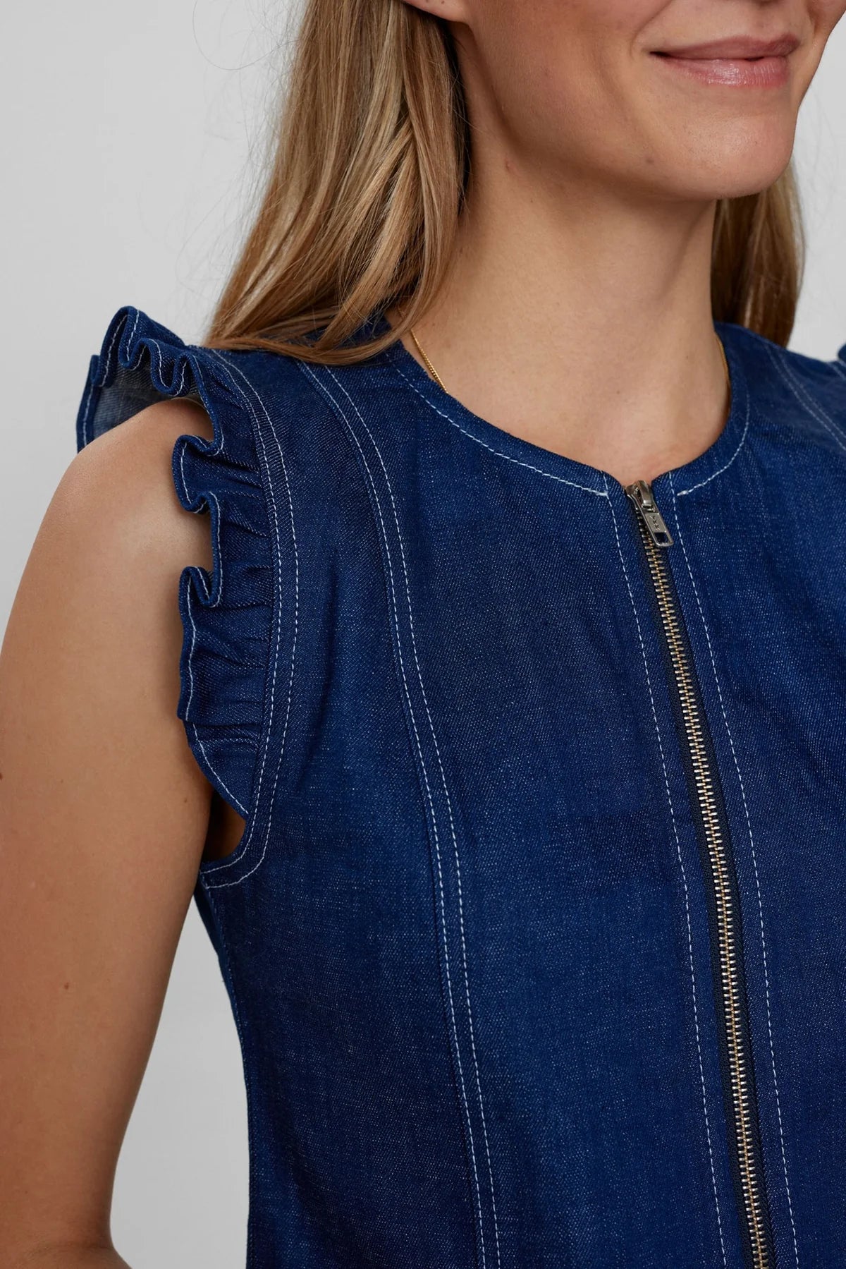 Denne top er i en dejlig let denim kvalitet med masser af stræk i kvaliteten. Den er fra Nümph og har søde flæsedetaljer ved ærmerne. Der er sat en lynlås foran som giver et mere råt look - derfor passer den også fint til et par jeans. Brug den åben som vest eller lukket som top.