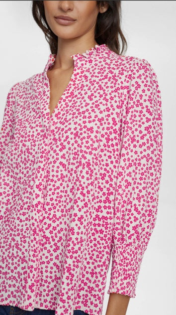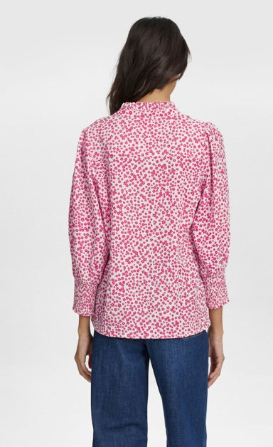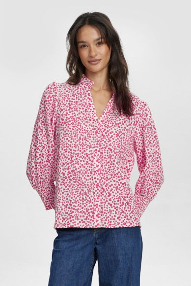 Smuk skjorte i hvid med lyserøde blomster fra Nümph. Den har trekvartærmer samt v-hals og knapper ned. Skjorten har smock på ærmerne og en fin flæsekant rundt på halsen. Den har en løs pasform, og kan f.eks. styles med et par flotte jeans.