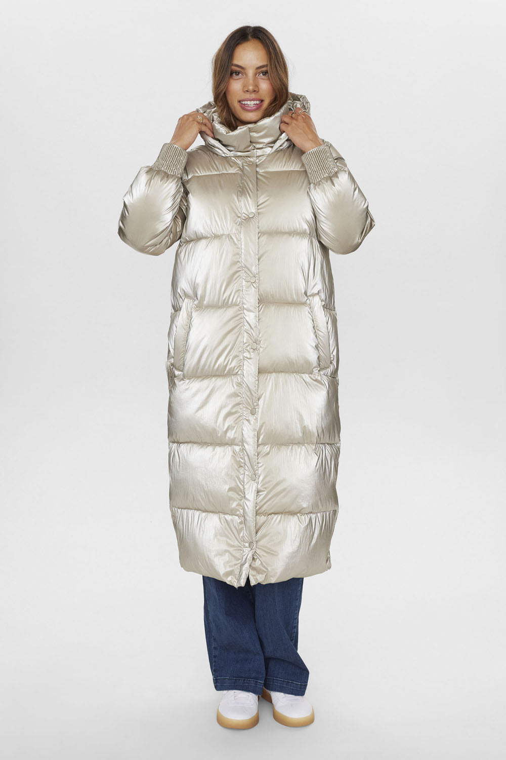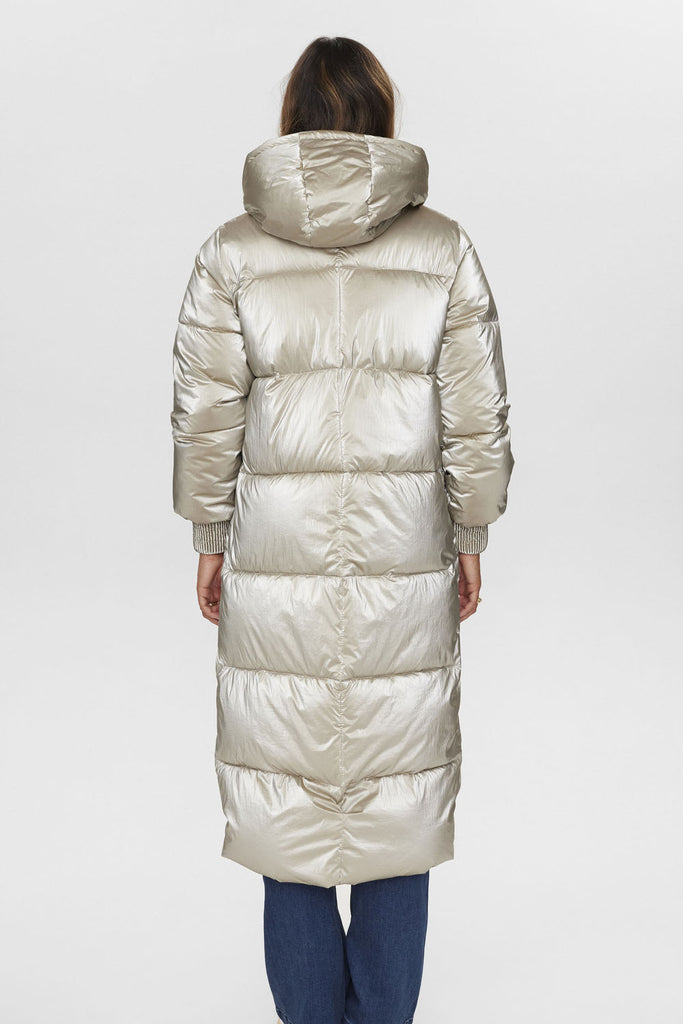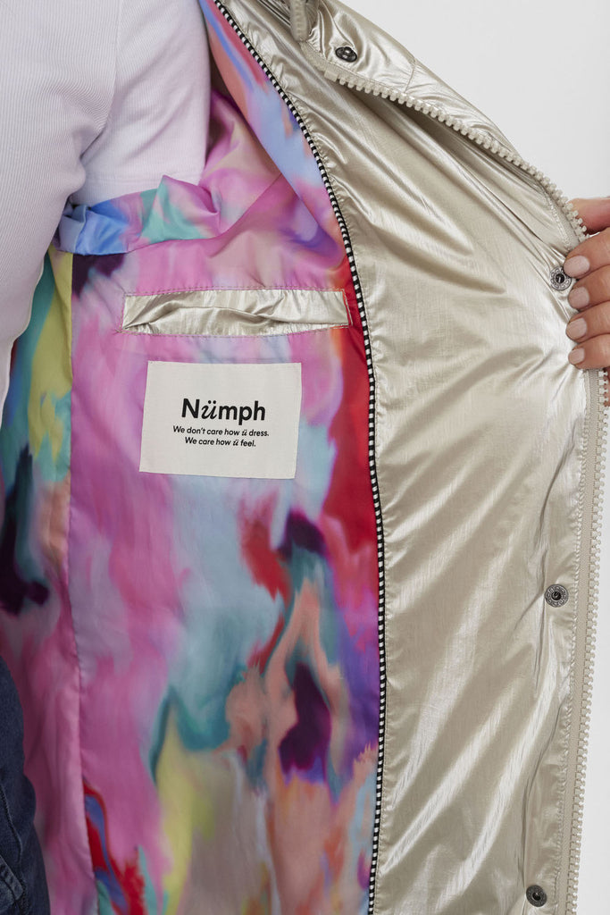Fantastisk jakke fra Nümph i et metallic look. Jakken har en puffet quiltet kvalitet, skjult lynlåslukning og tryknapper. Med skrålommer, lækker hætte og knapper i siderne for optimal bevægelighed.