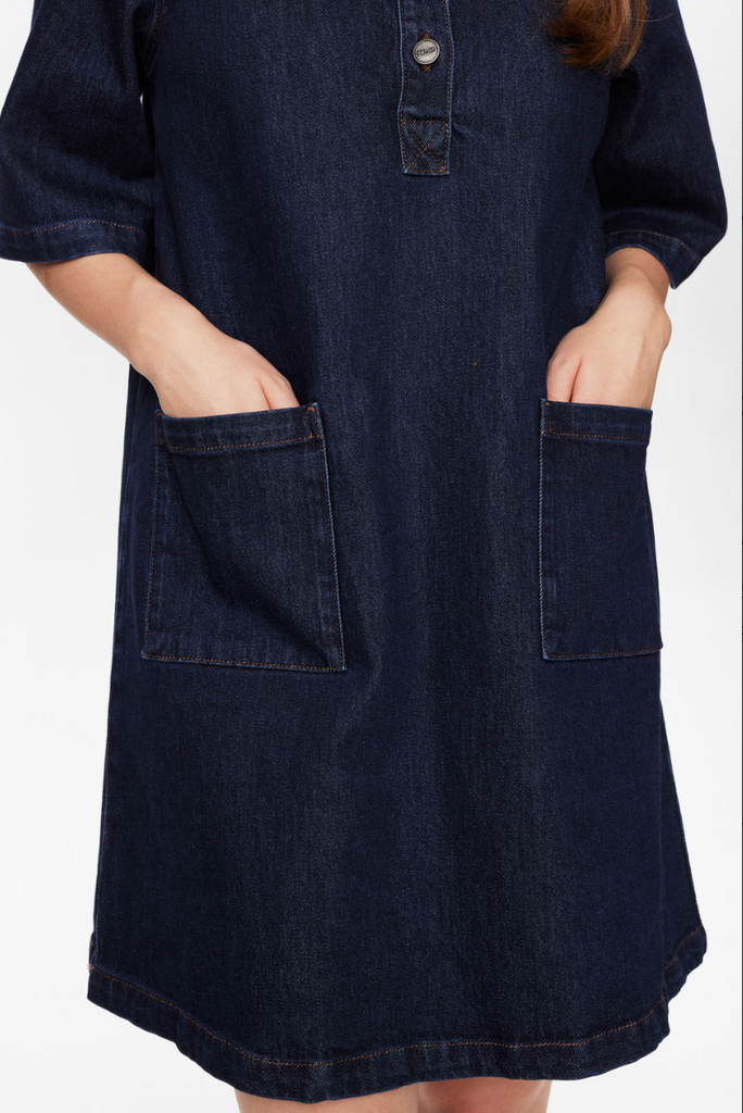 Smuk dark blue denim kjole med krave og lommer fortil. Kjolen er i A facon med vide ærmer og 4 knapper fra kraven og ned.