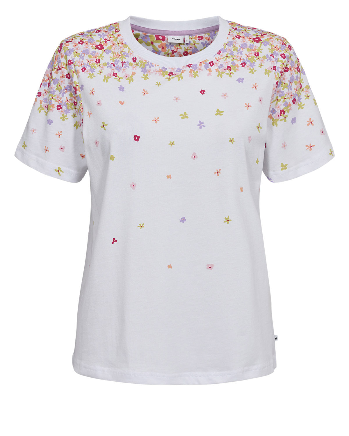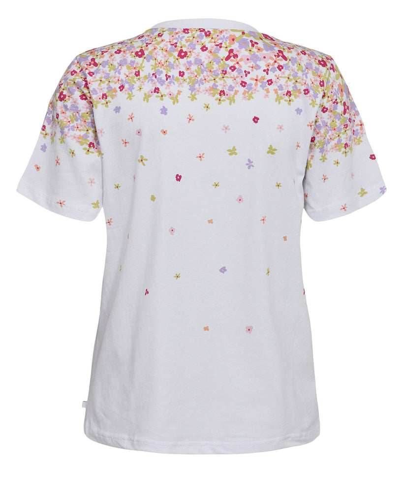 Lækker blød bomulds t-shirt fra Nümph i hvid. T-shirten har en let løs pasform og blomster i multifarver.