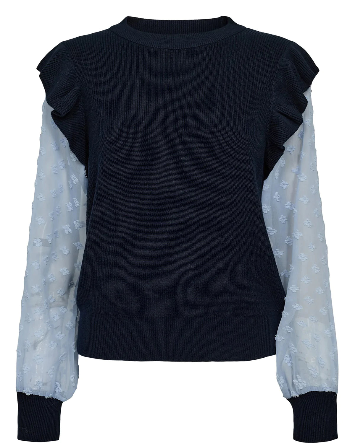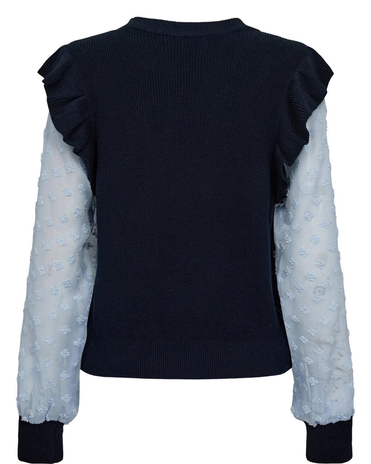 Cool strik fra danske Nümph med lyseblå blondeærmer. Strikken har rund halsudskæring og flæsedetalje over skuldrerne.