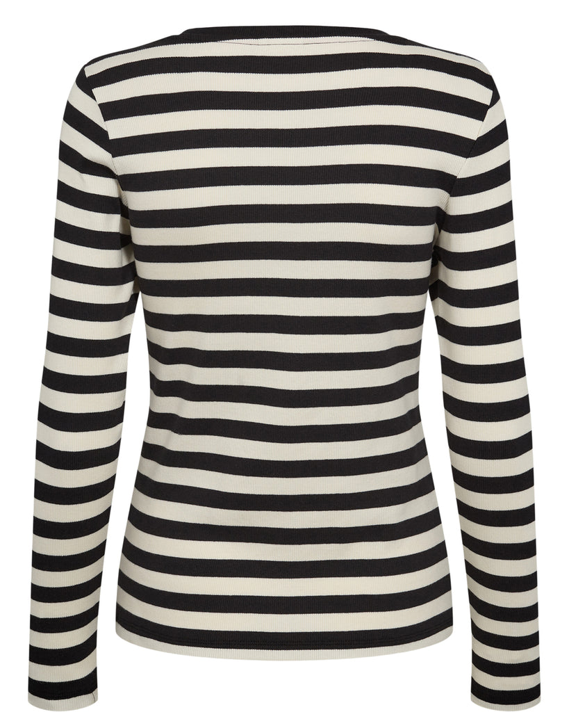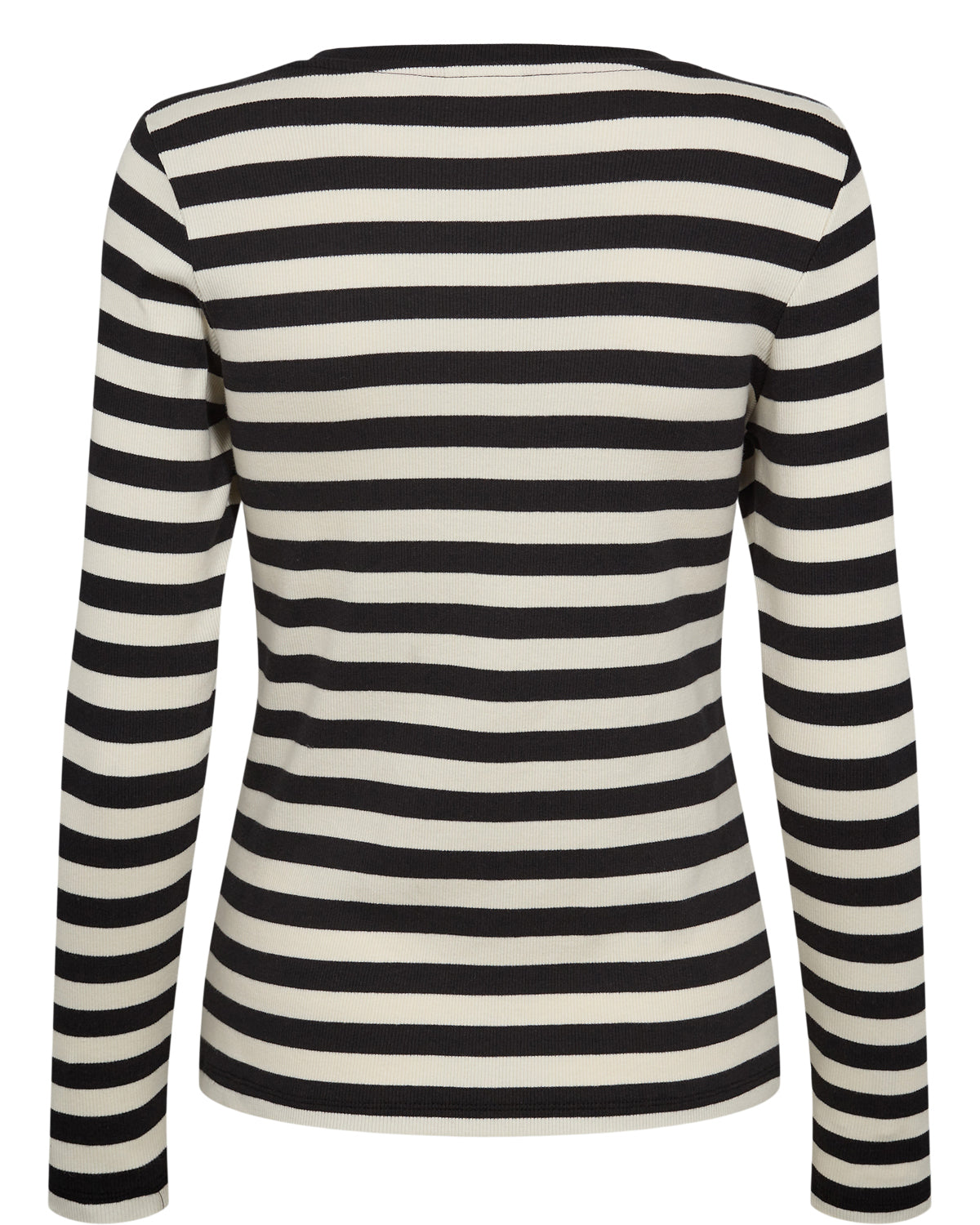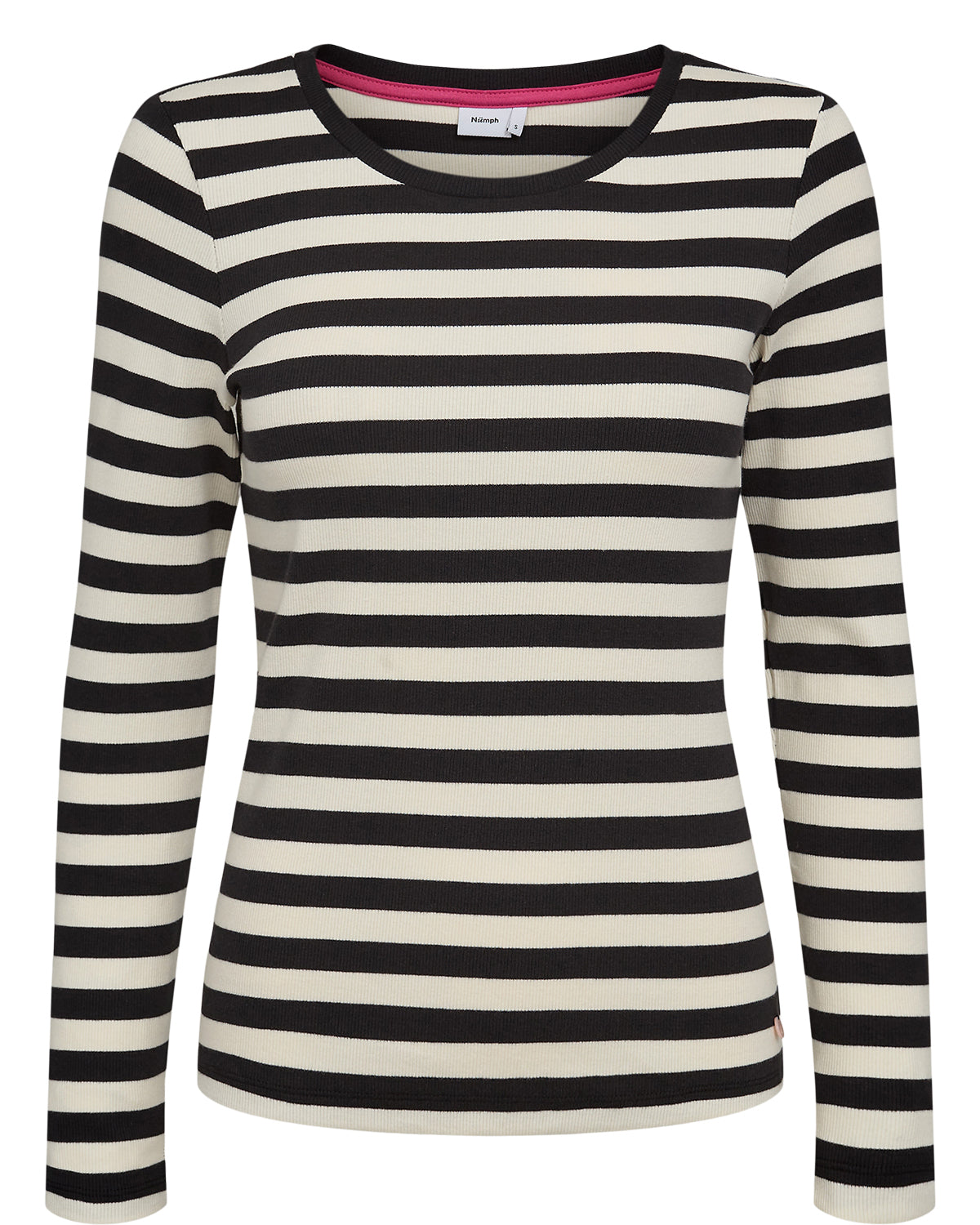 Skøn basisbluse i ren bomuld og fine striber fra Nümph. Blusen er i en blød rib-kvalitet med rund hals og lange ærmer.