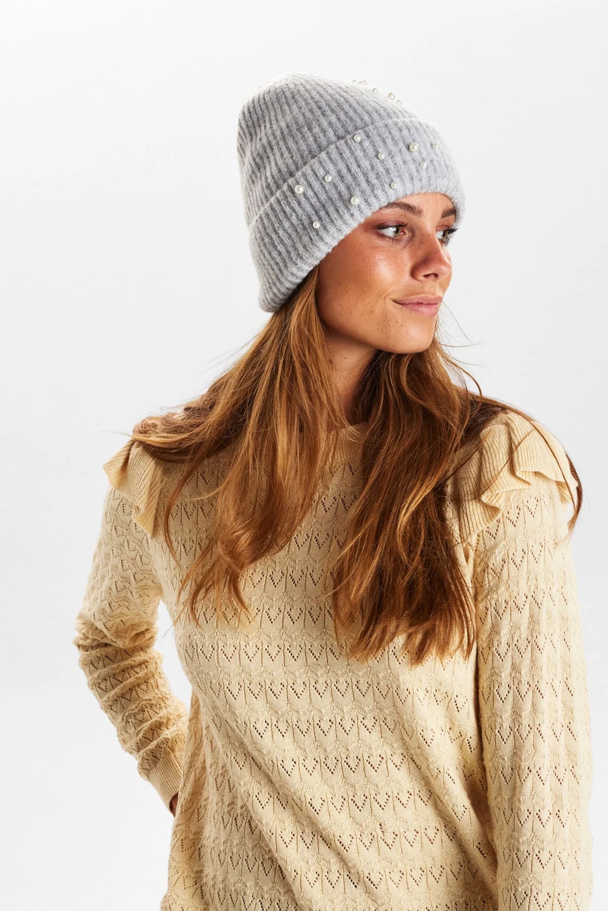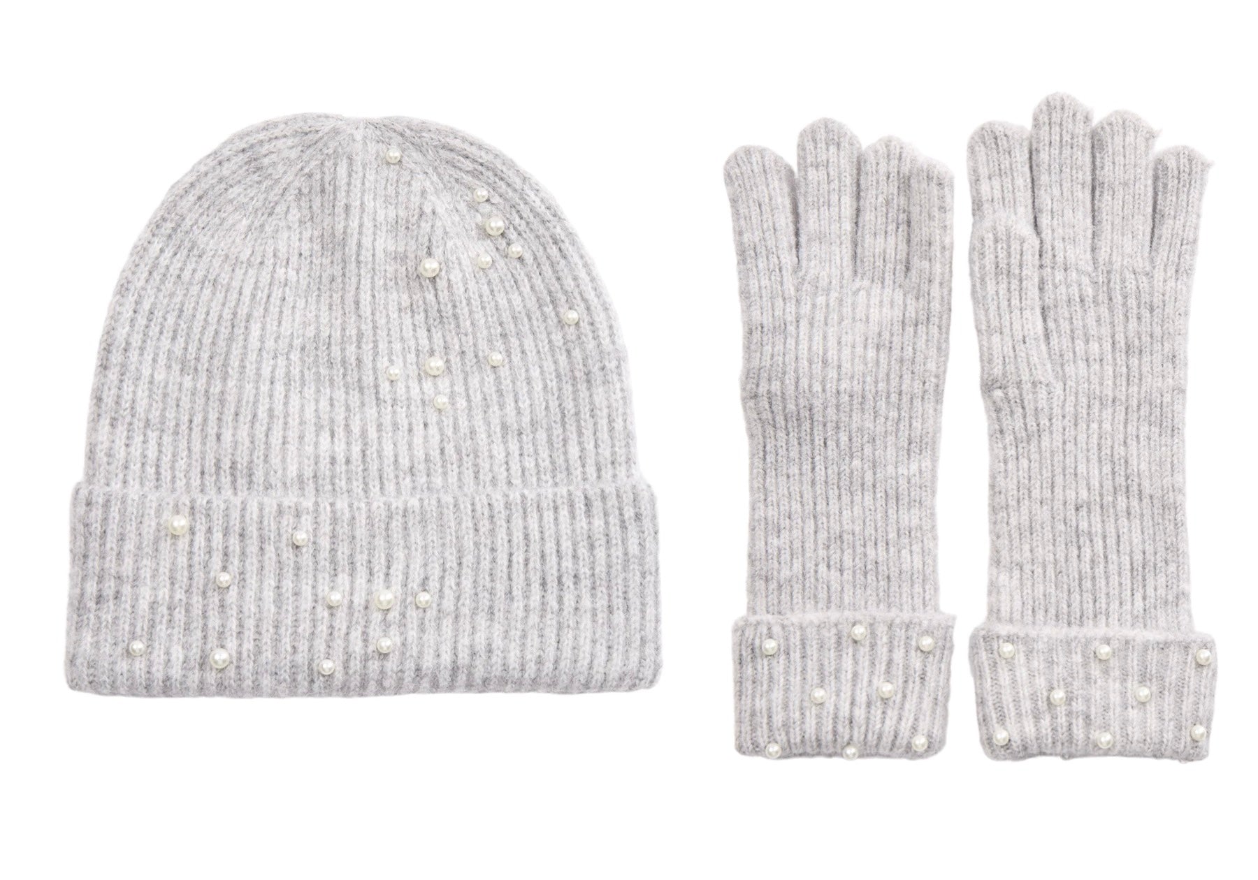 Skøn sæt af hat og handsker fra Nümph. I en flot lys grå farve og med perledetaljer.