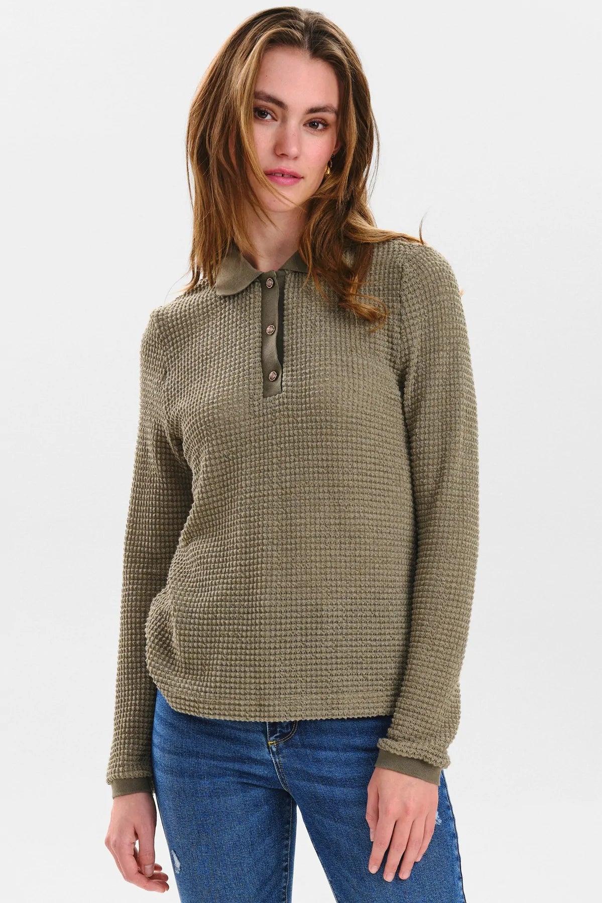 Lækker langærmet polo fra Nümph. Poloen har lange ærmer, krave samt stolpelukning med de fineste knapper.