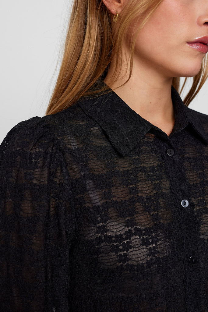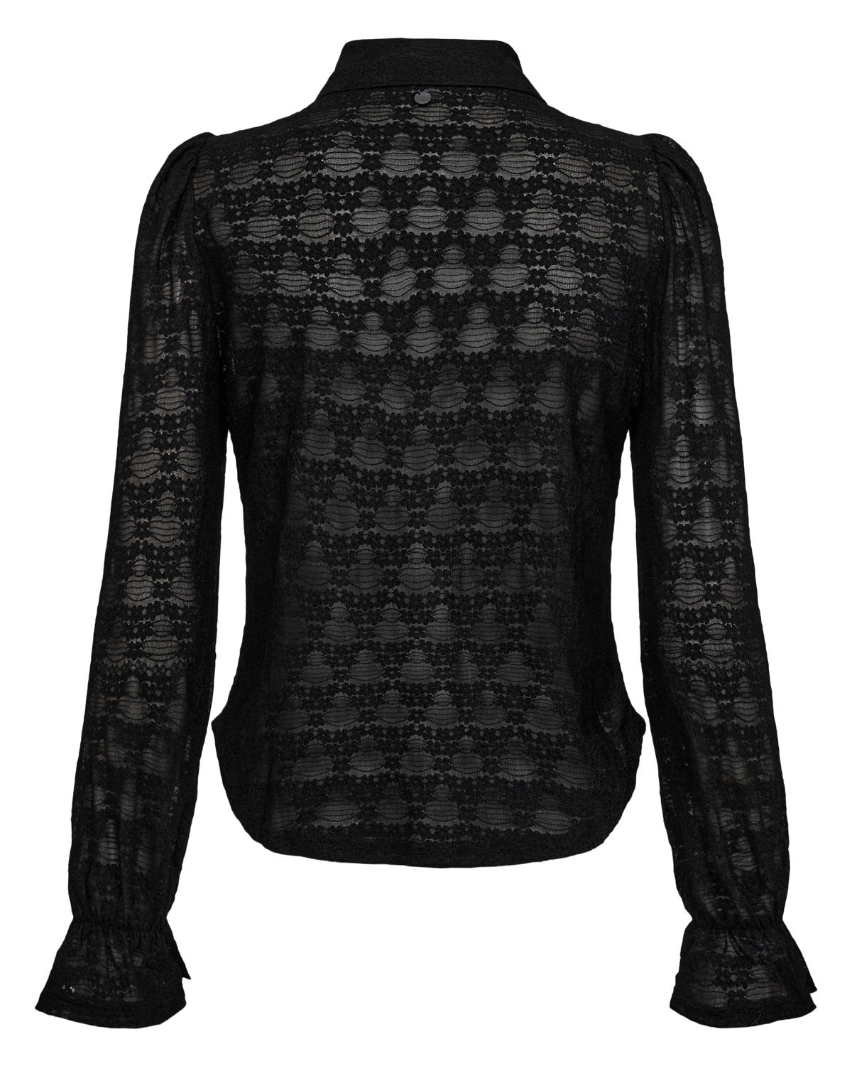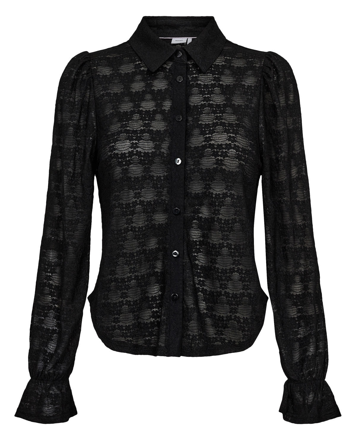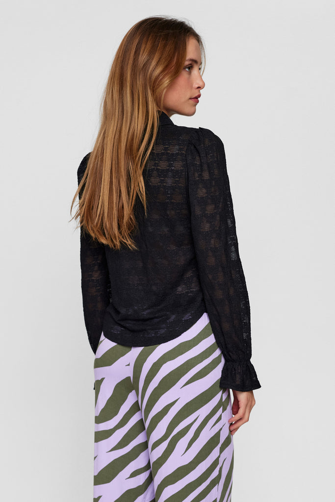 Super skøn blonde bluse fra Nümph i en klassisk sort farve. Blusen har krave, masser af stretch og elastik detalje ved ærmeafslutning.