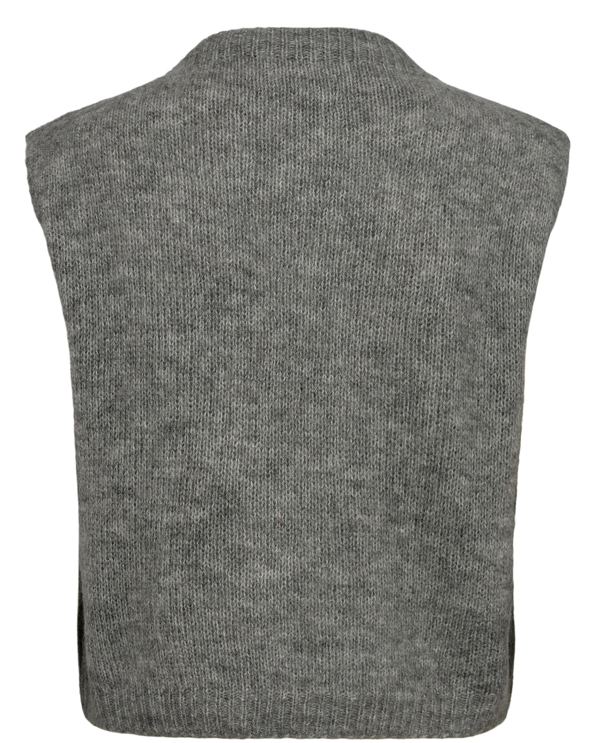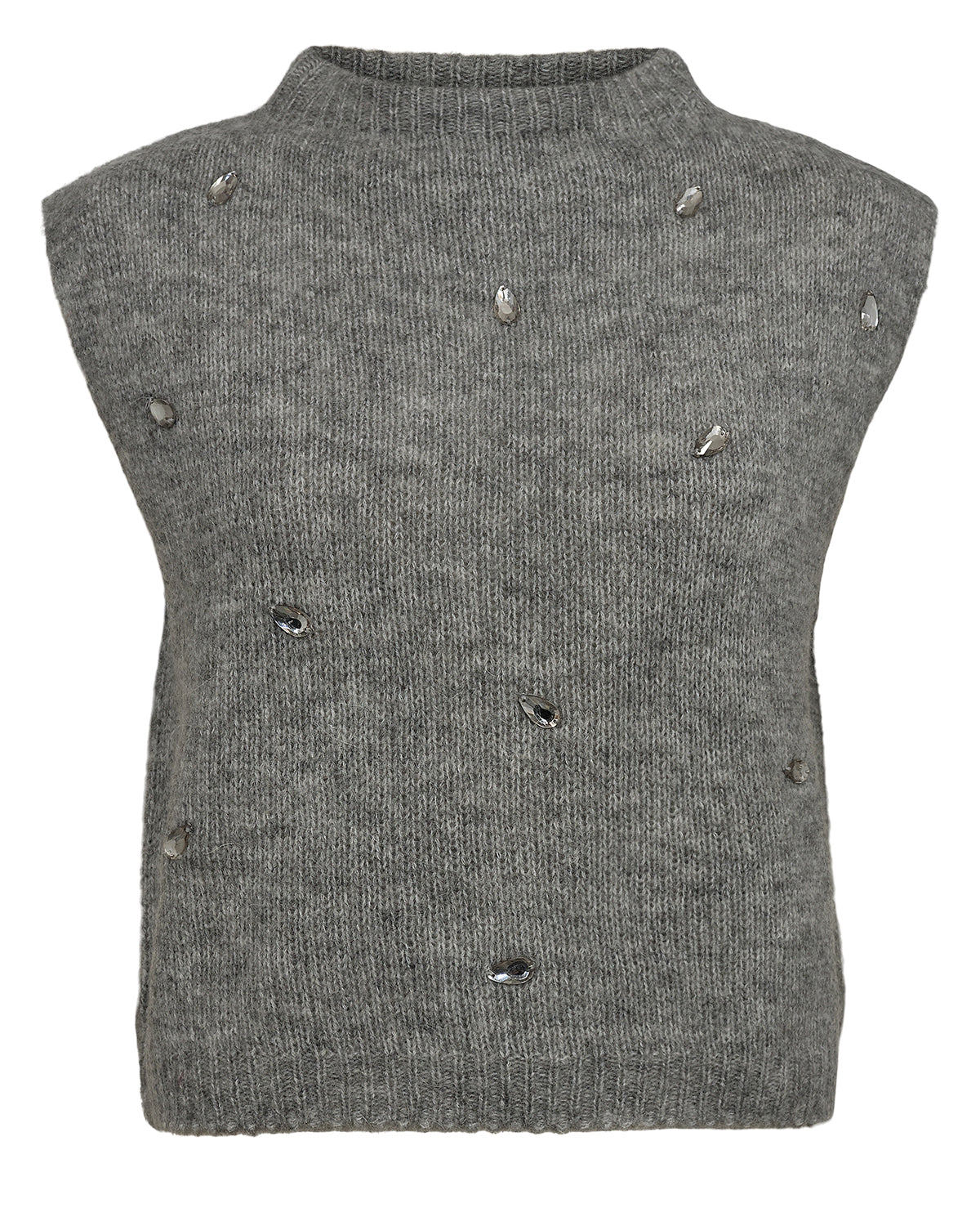 Lækker blød strik vest fra Nümph med påsyede sten. Vesten har en løs pasfom og en lille høj hals.