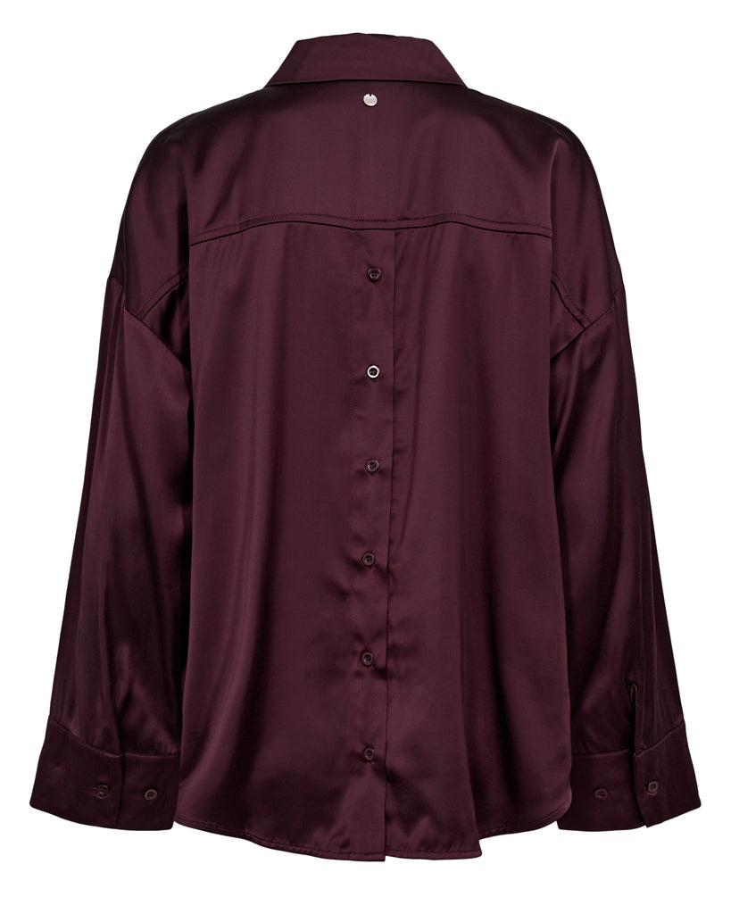 Smuk bluse i elegant bordeaux. Med skjult knapper foran, krave og fed knap detalje bagpå.Der findes matchende bukser.