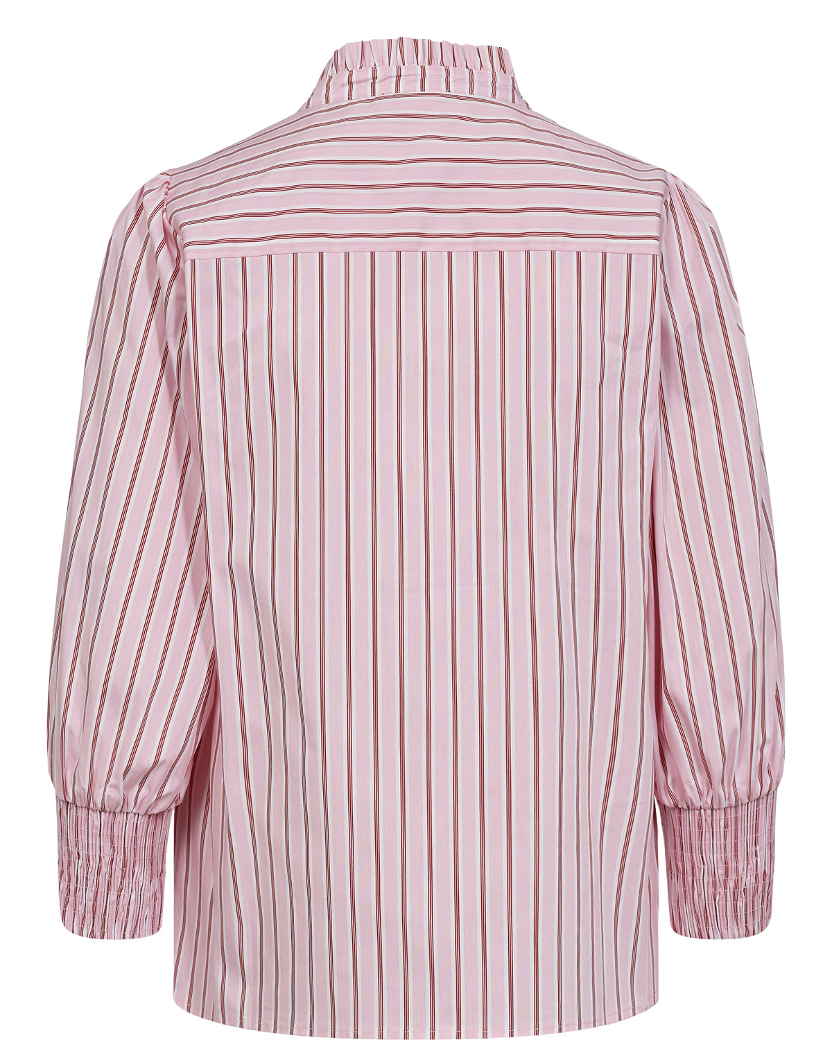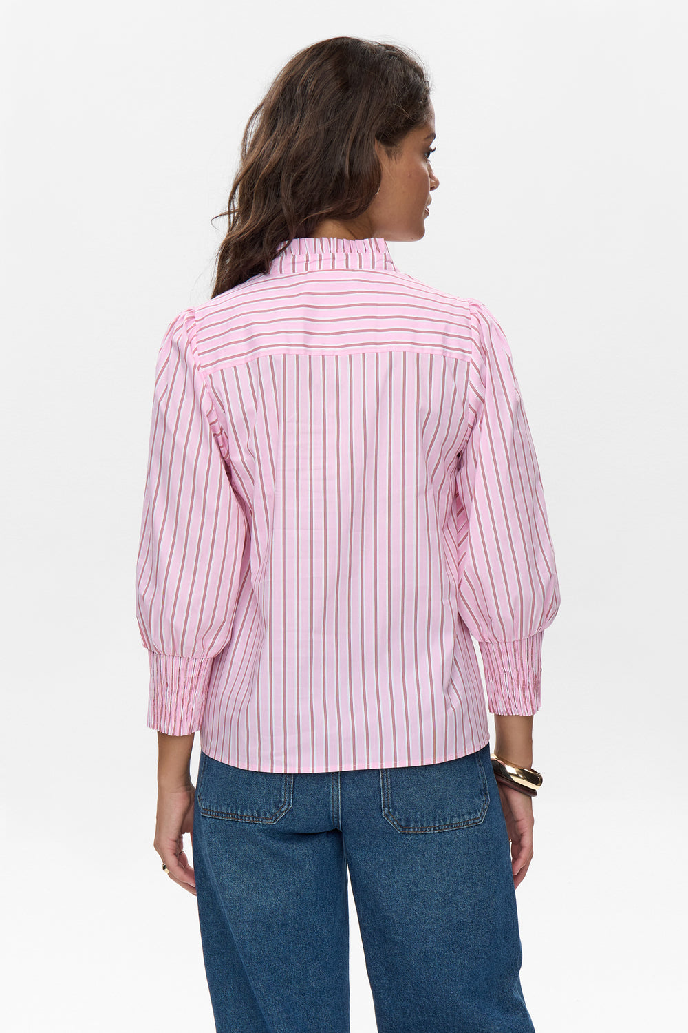 Fin bomuldsskjorte fra Nümph i lyserød med striber. Skjorten har v-udskæring med flæse omkring halsen og smock ved ærmeafslutning.