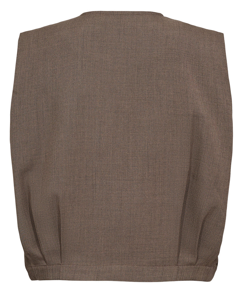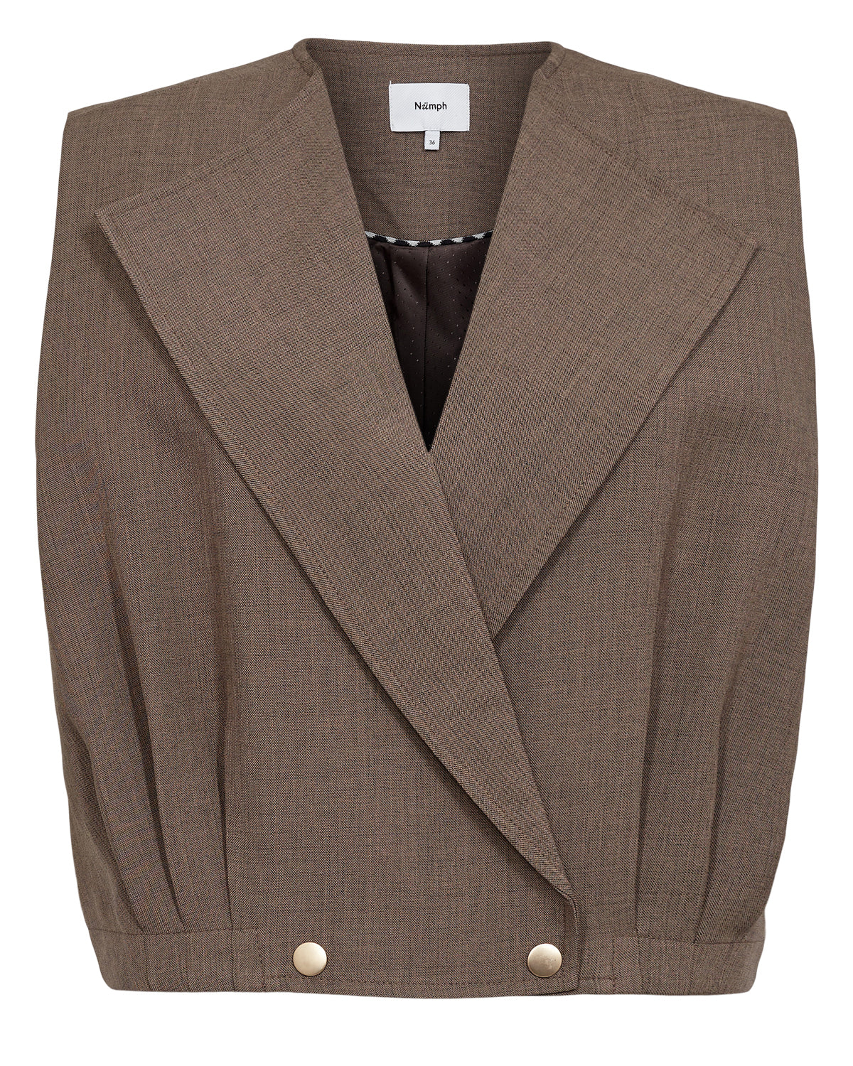 Cool cropped vest fra Nümph i en flot brun melange. Vesten har cool detaljer i form af revers og fed dobbeltlukning fortil med trykknapper. Med læg der giver en ekstra detalje.