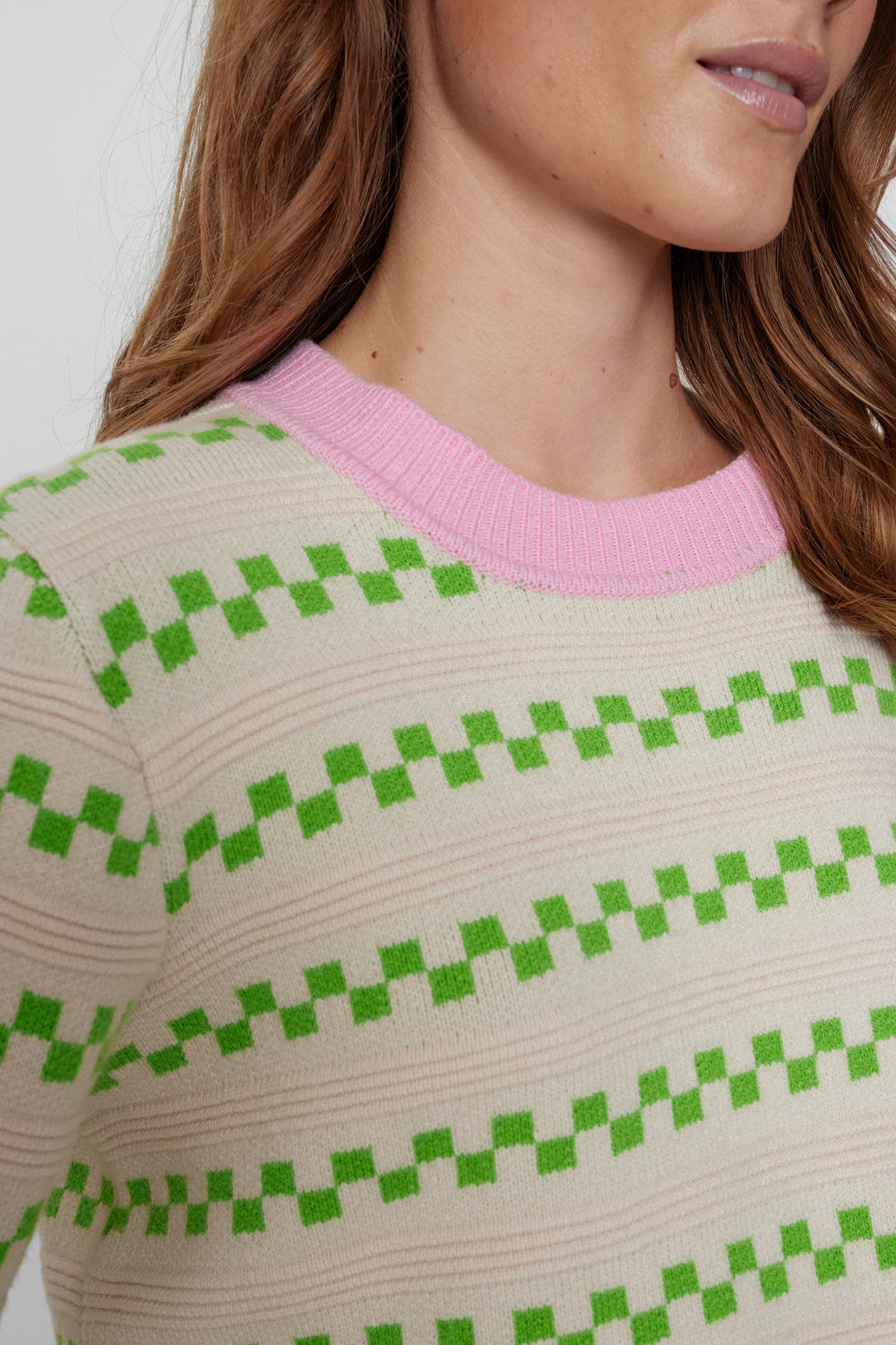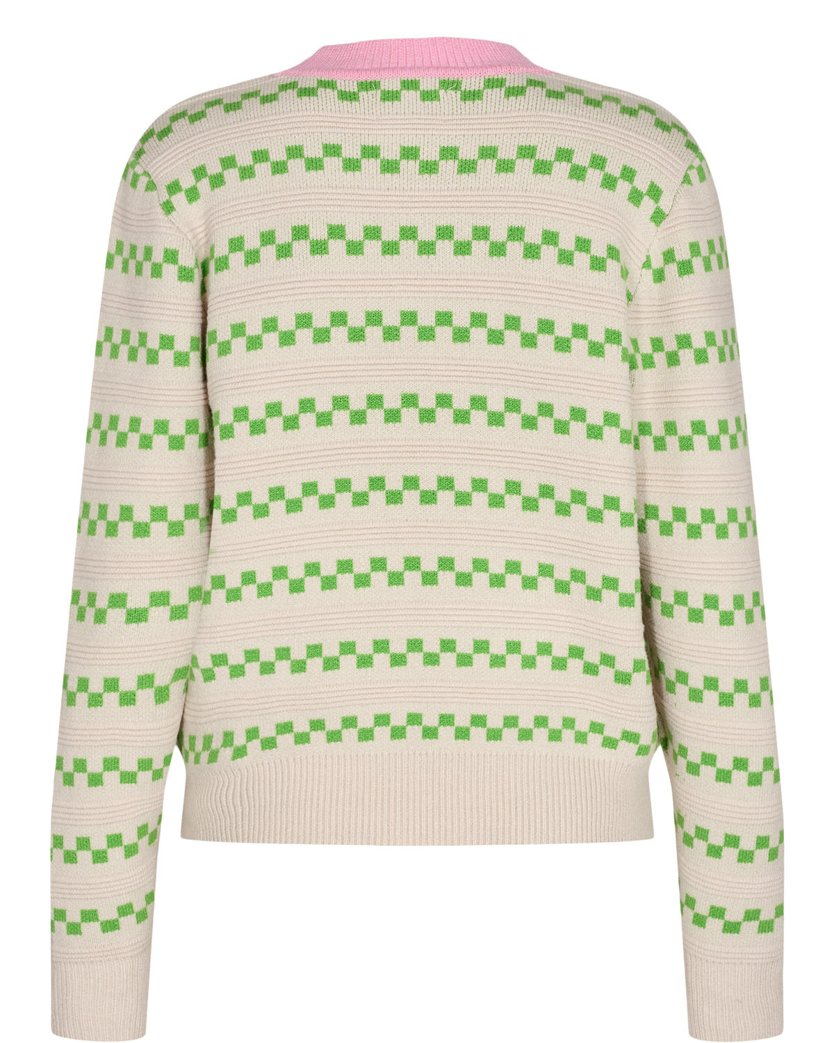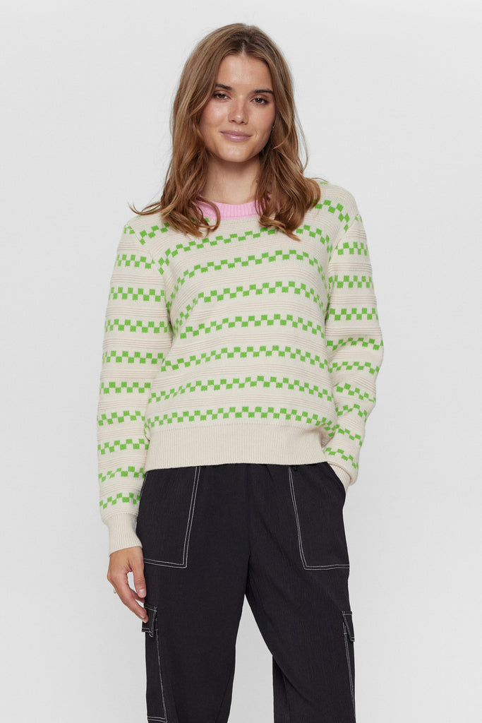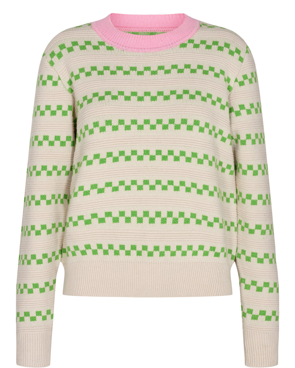 Super lækker skrik med det fineste mønster i en frisk grøn farve, samt en lyserød farve rundt i halsen. Pasformen er let oversized og strikken har den blødeste lækre kvalitet.