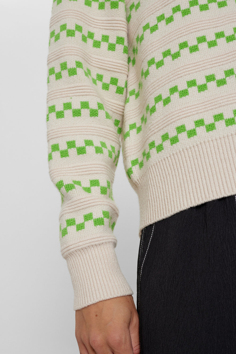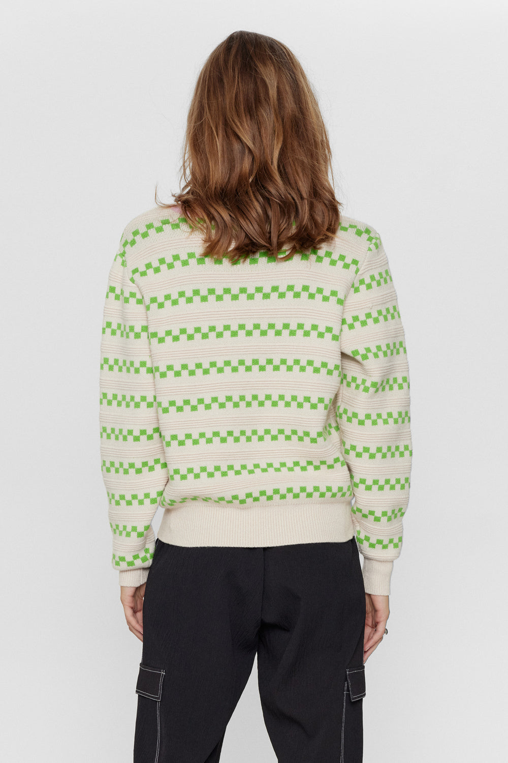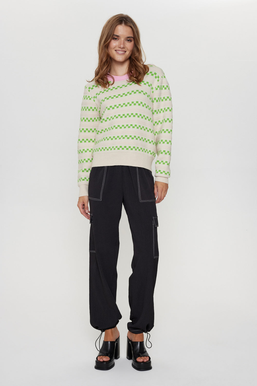 Super lækker skrik med det fineste mønster i en frisk grøn farve, samt en lyserød farve rundt i halsen. Pasformen er let oversized og strikken har den blødeste lækre kvalitet.