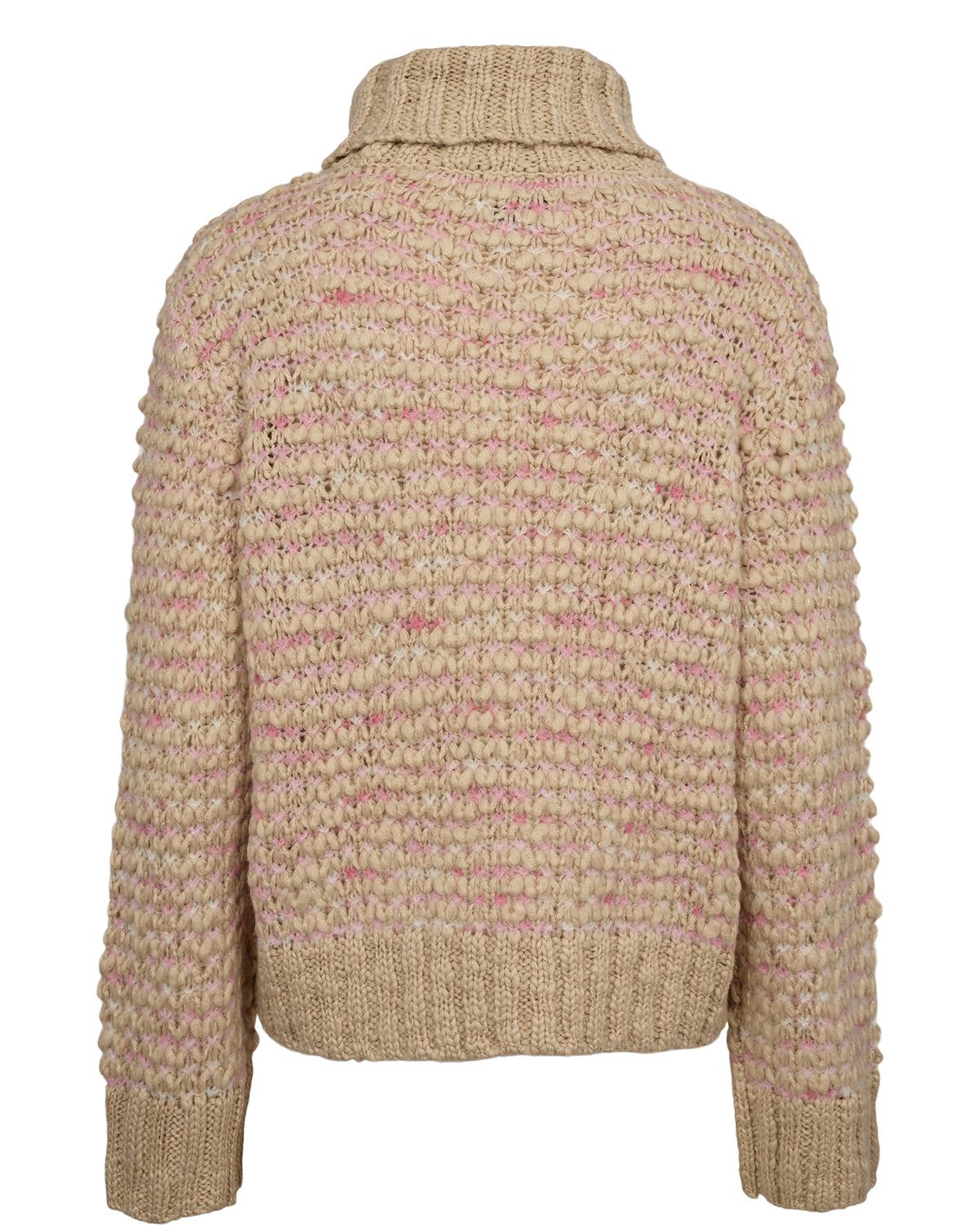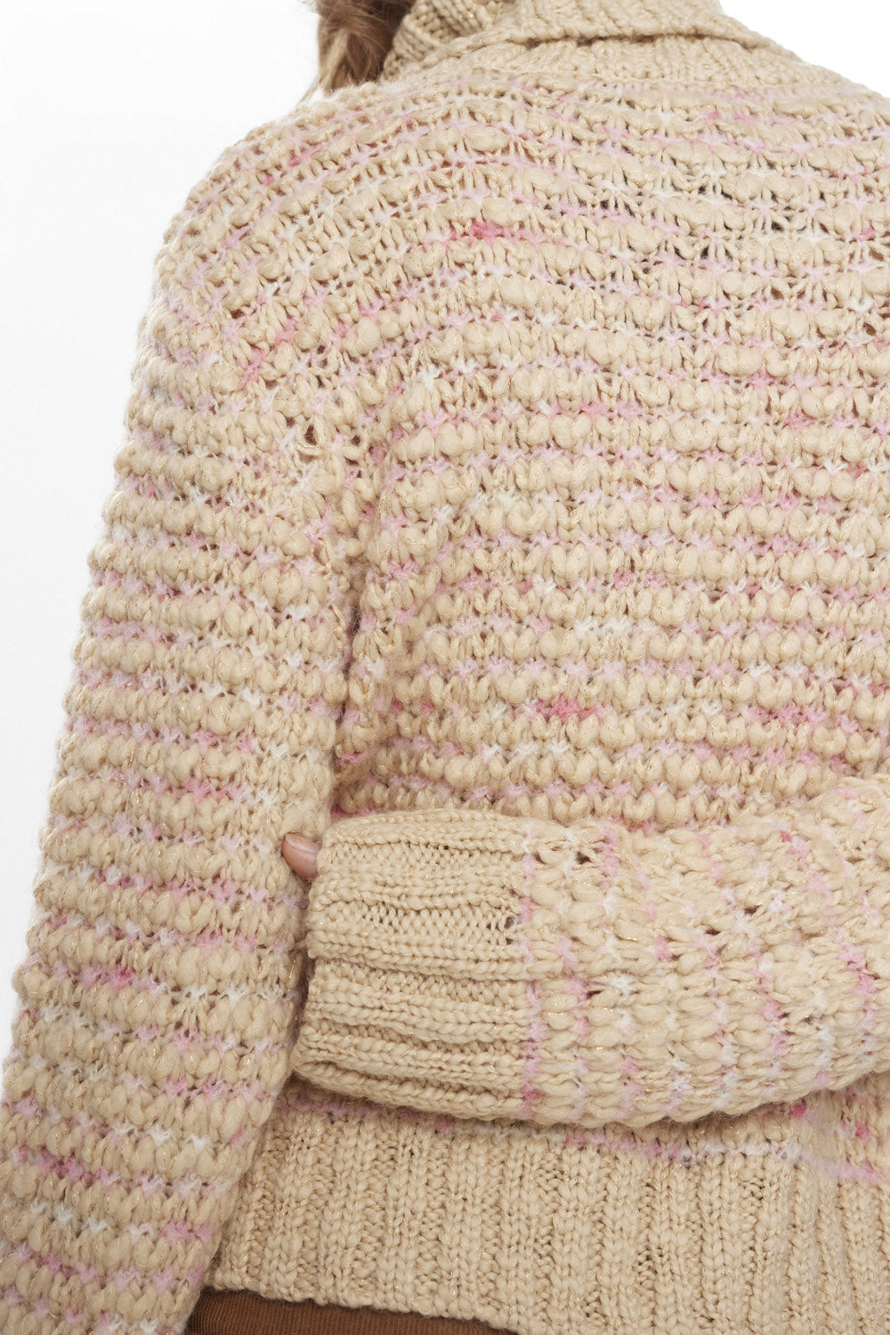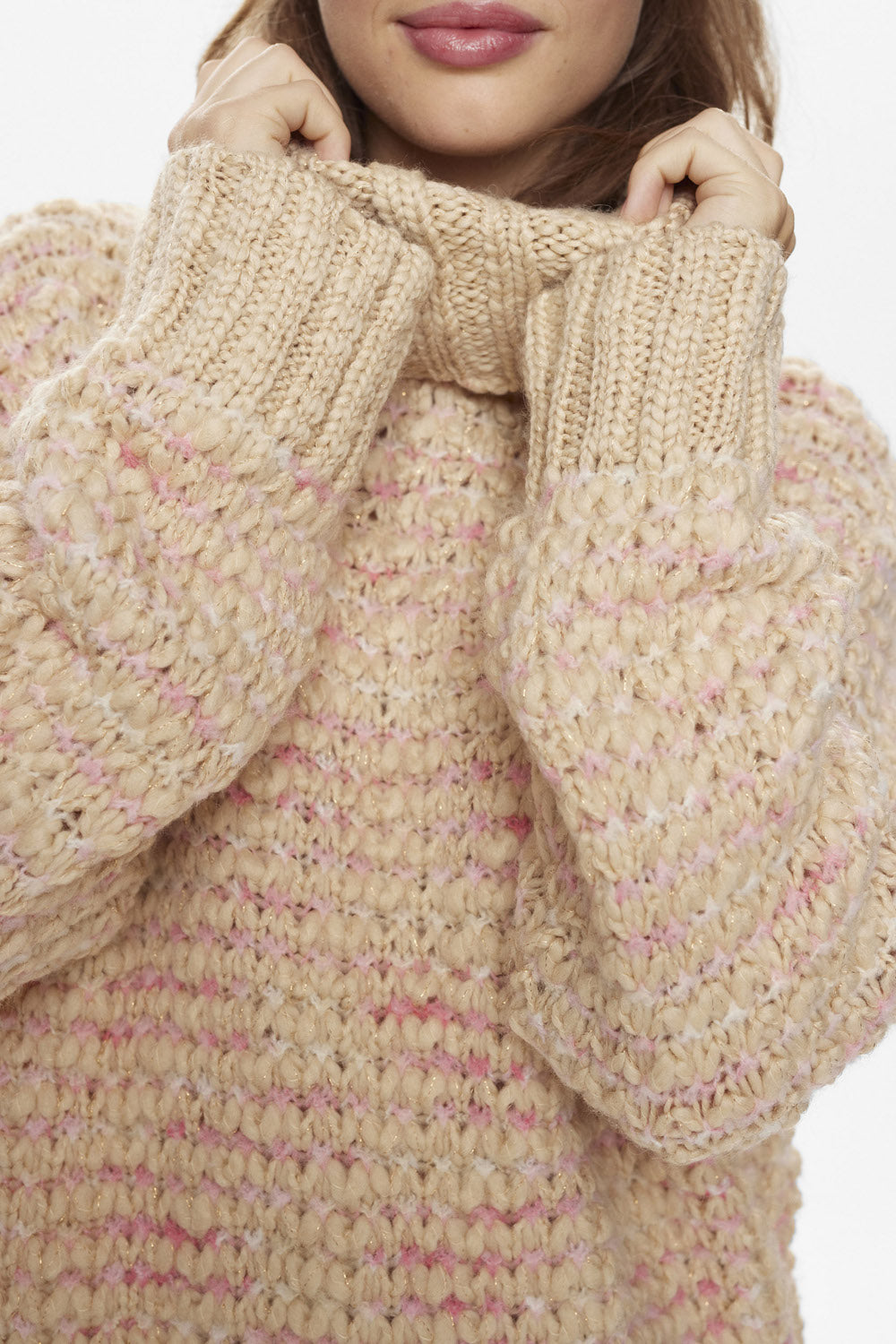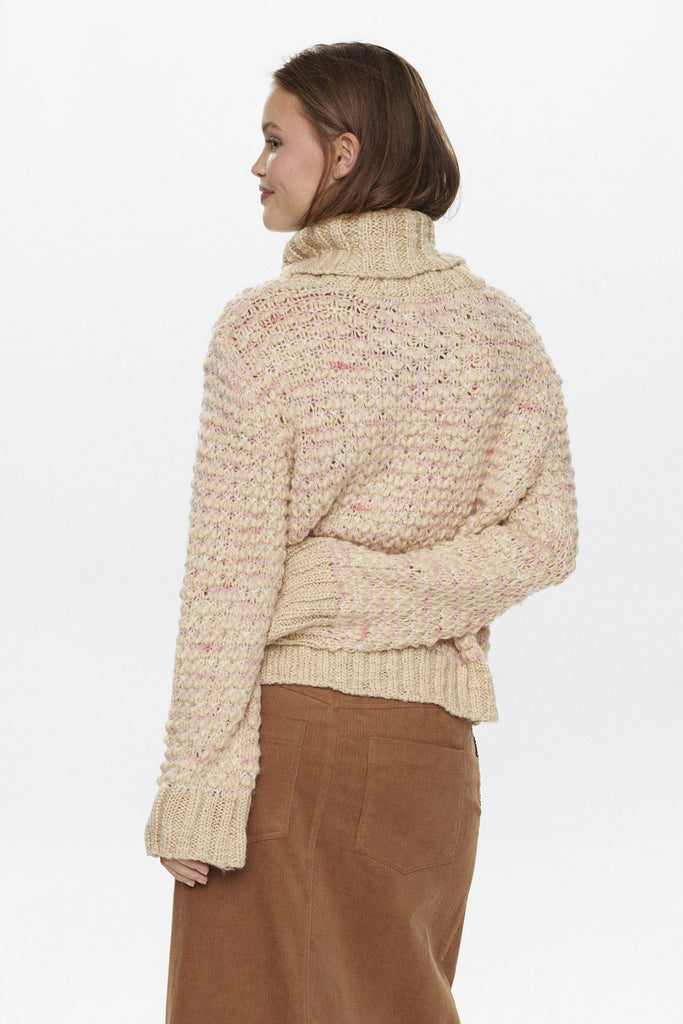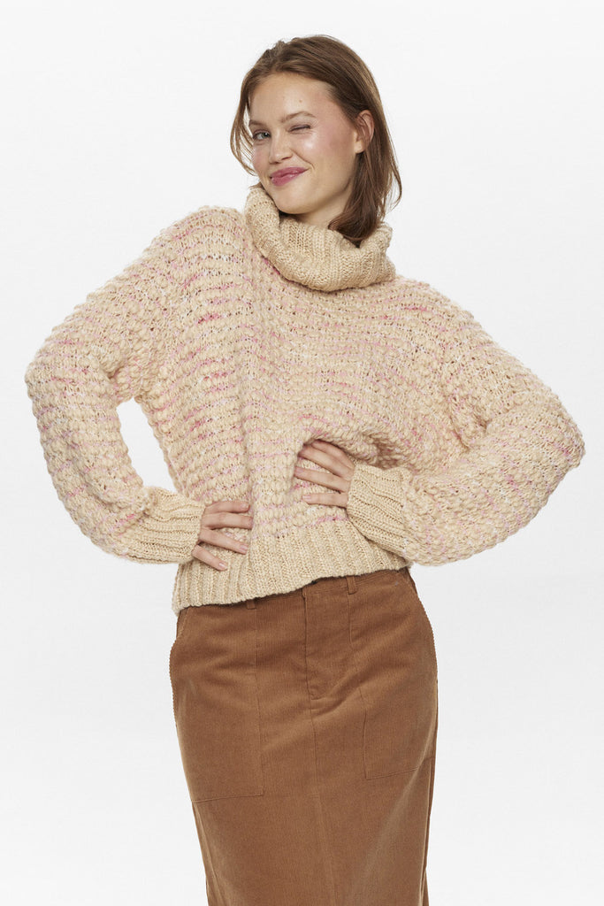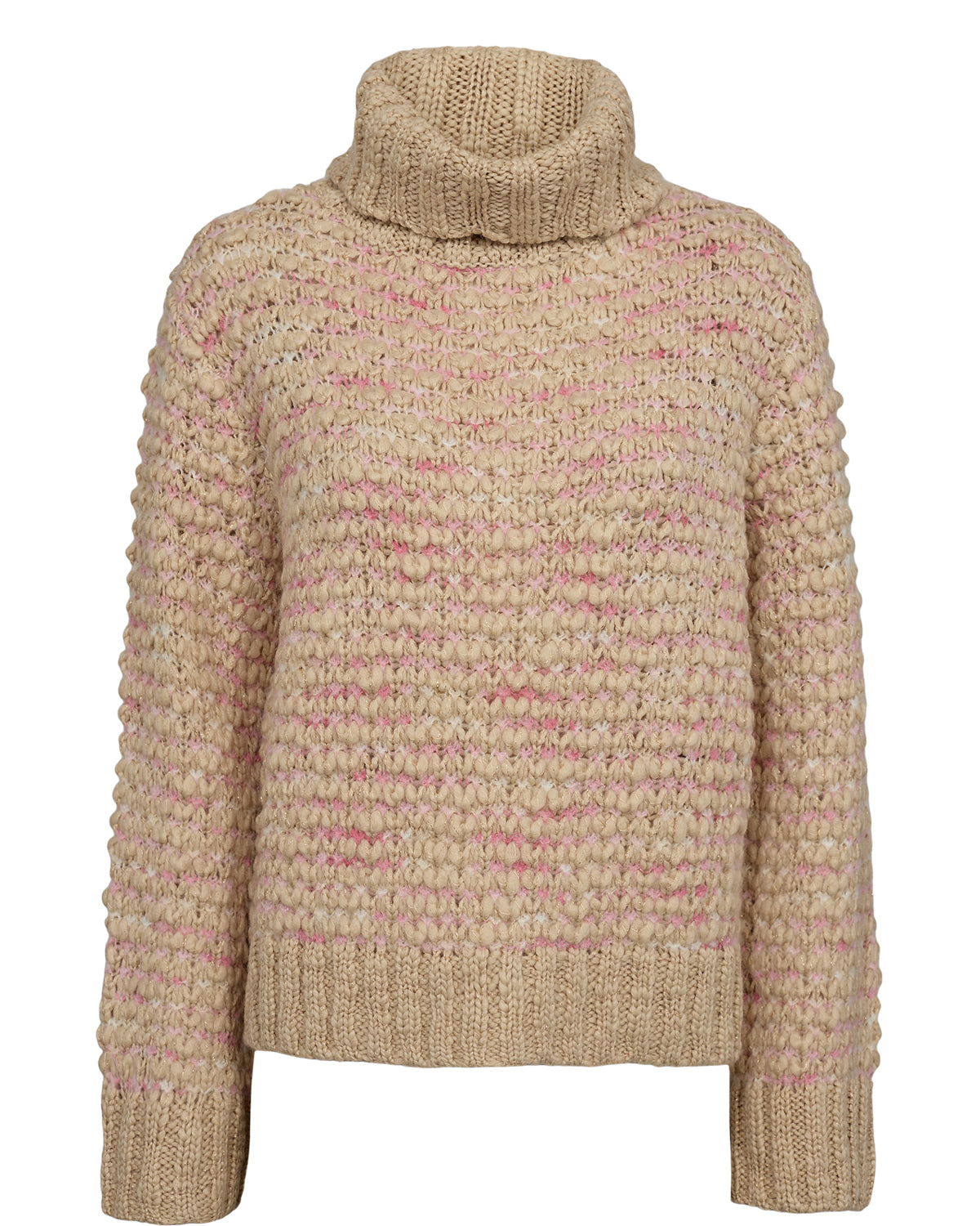 Den smukkeste strik i en lys beige farve med både lyserød og guld tråd strikket i. Strikken har en løs pasform, høj hals og brede ribkanter.