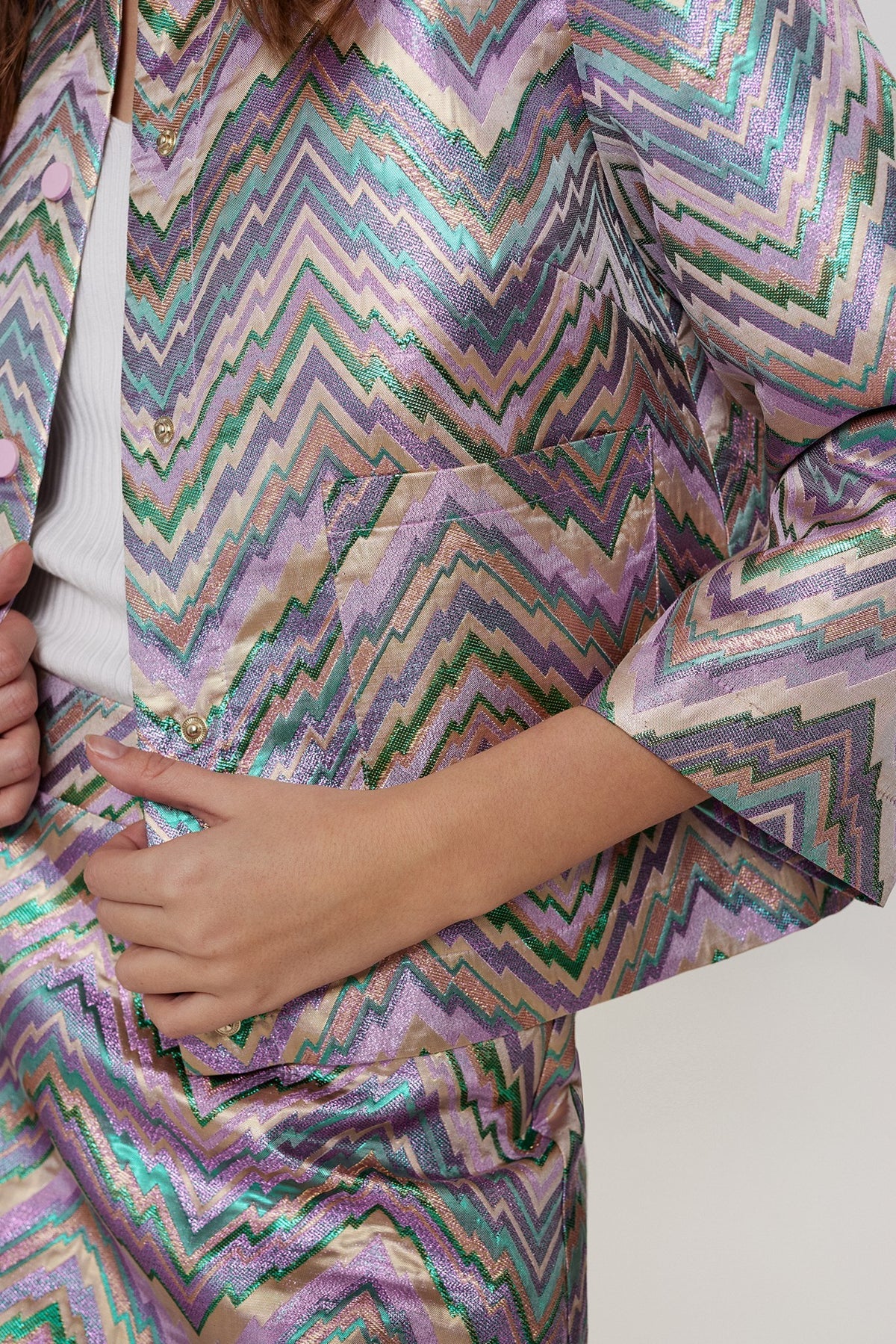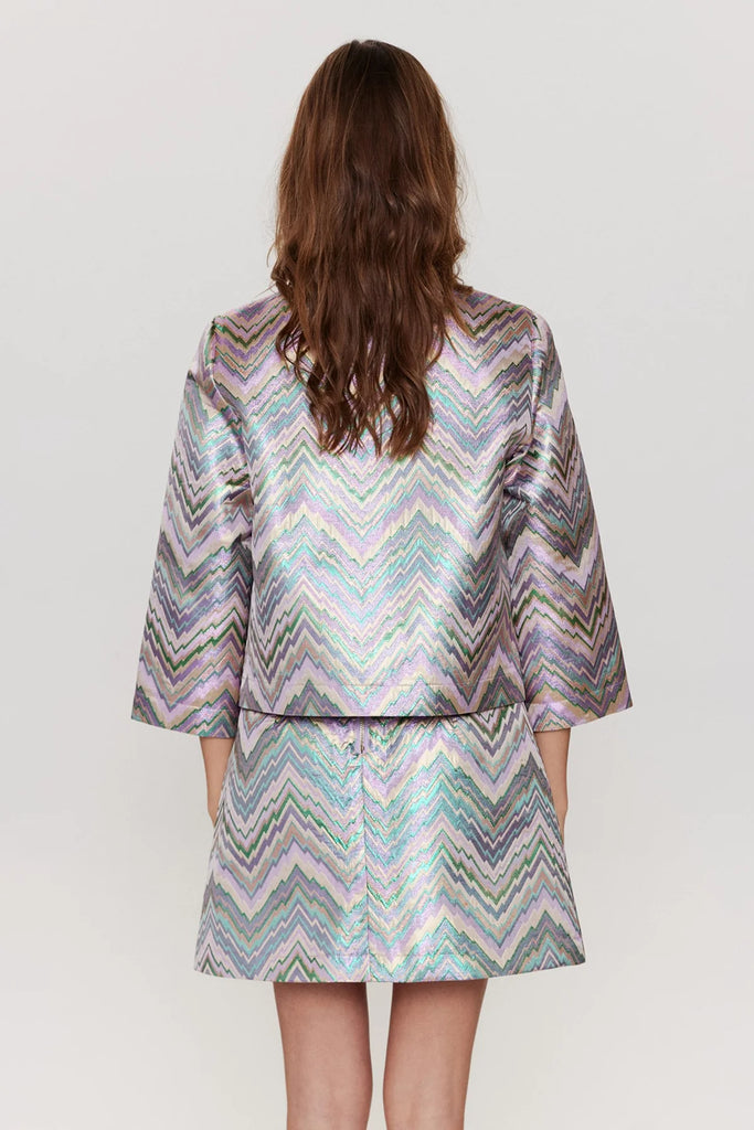 Smuk og elegant jakke i fine farver. Let glimmertråd indvævet. Løs pasform.