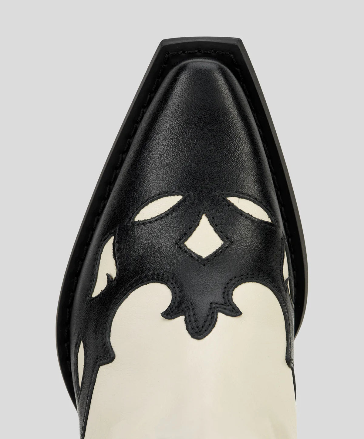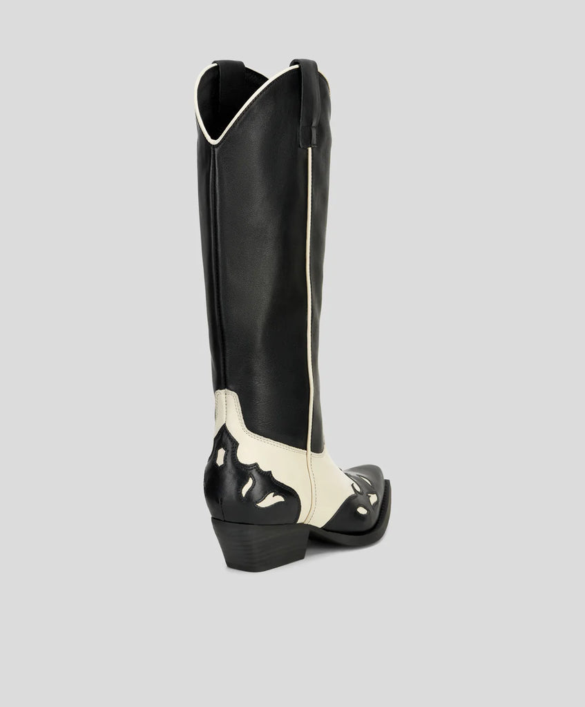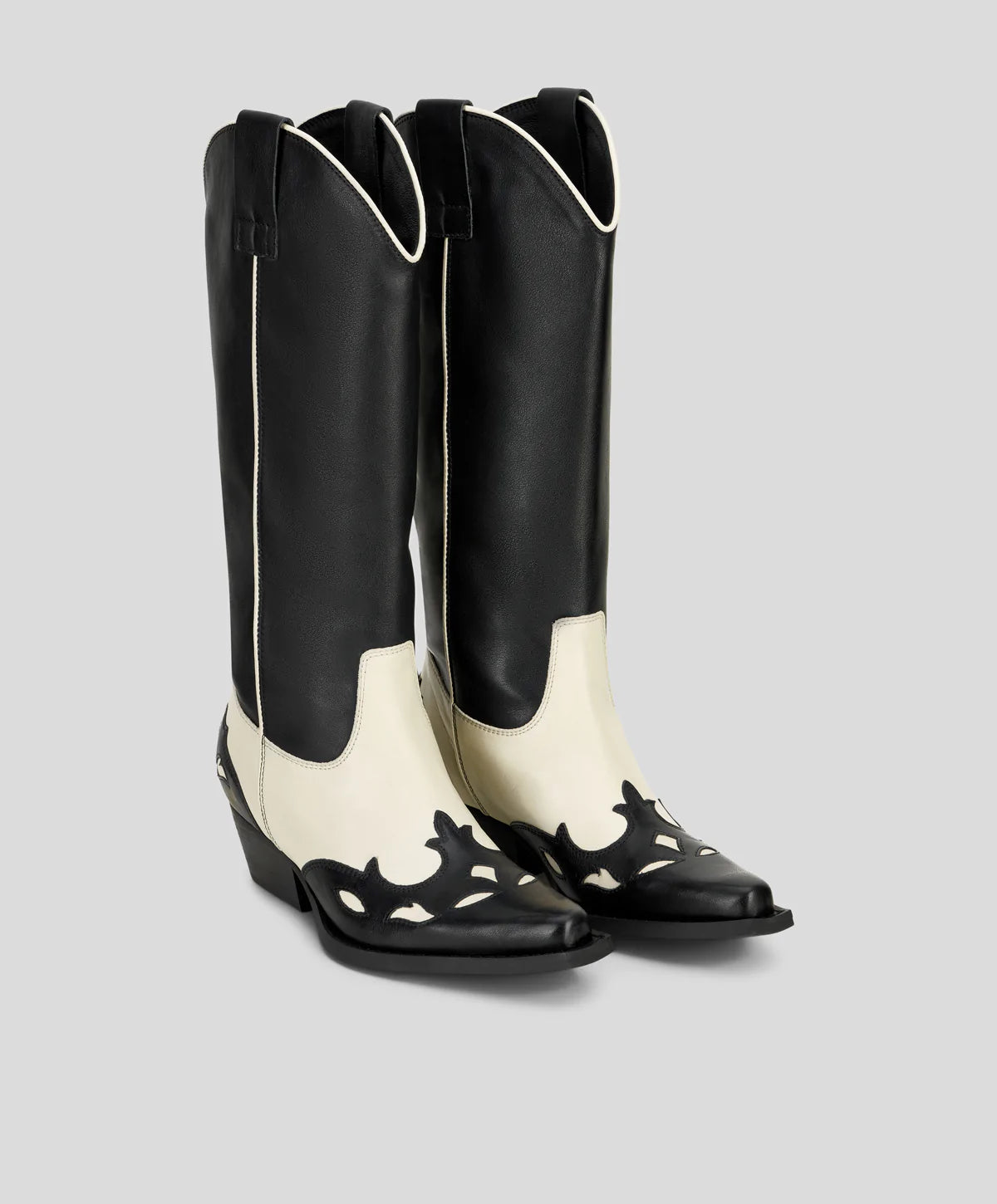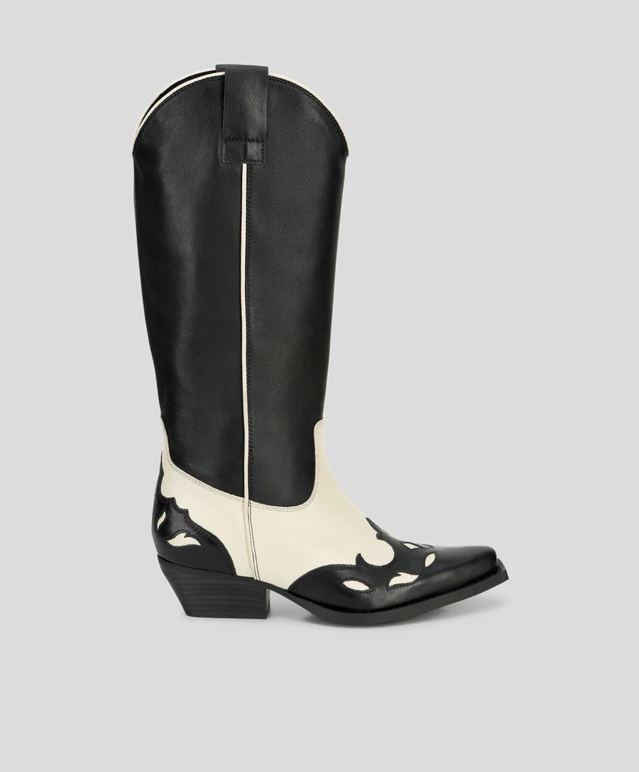 Den SEJESTE støvle fra Phenumb i cowboy-stil. Fedt, luksus skind med hvide stiklinger - lille hæl - spids snude. Virkelig en luksus-statement-støvle!