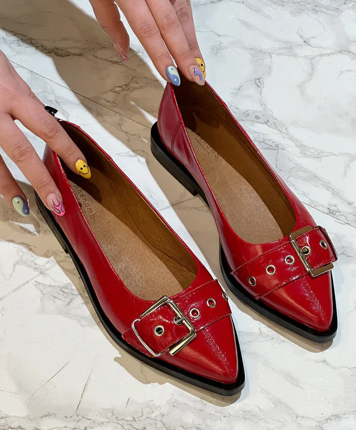 Flotte ballerina/loafer fra Phenumb i rød lak . Den ellers fine sko får lige lidt kant og "råt" over sig med den chunky bund.