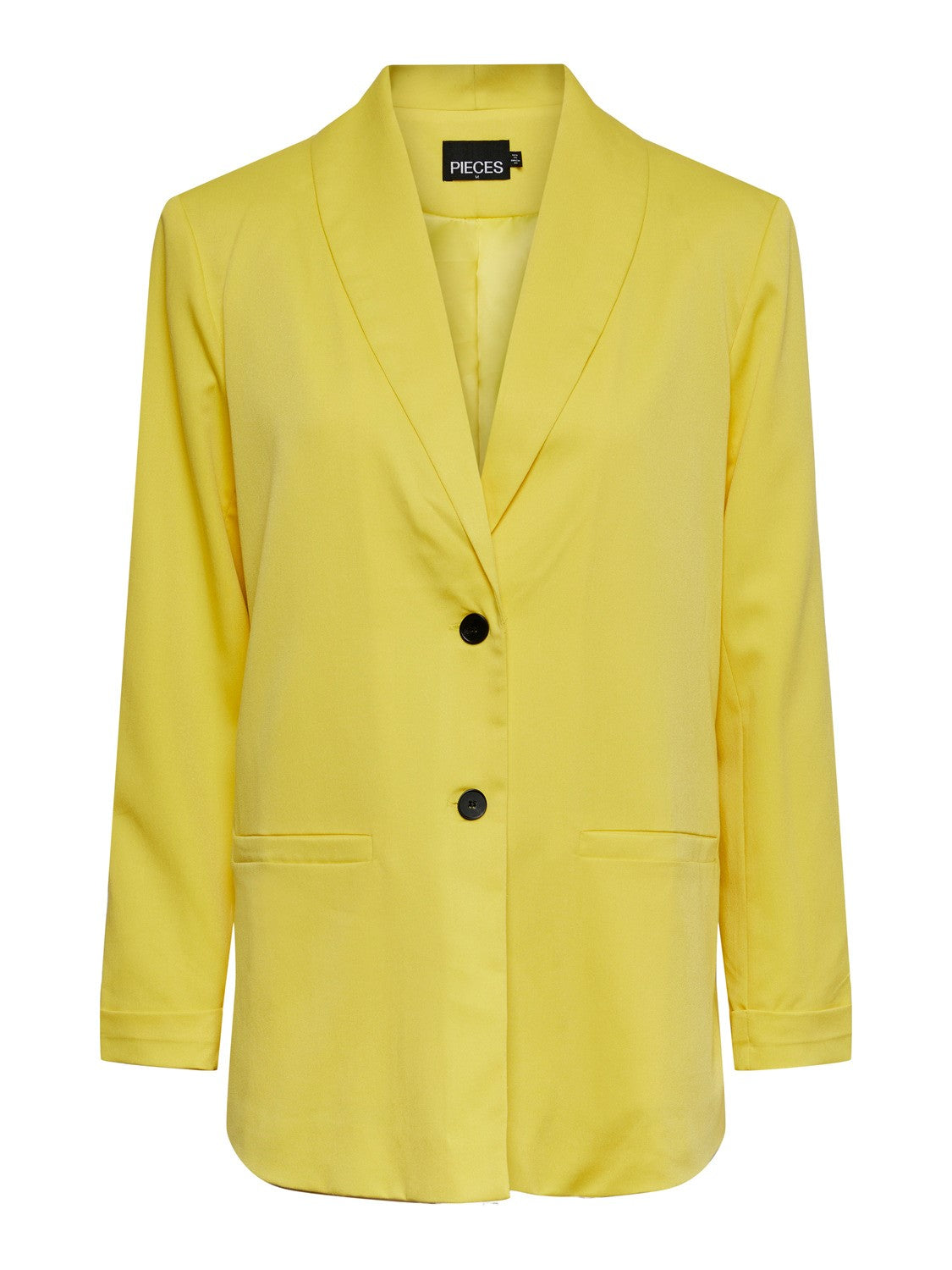 Skønneste blazer jakke fra Pieces. Blazeren er let oversized med 2 knapper foran. Blazeren kan vaskes i maskinen og har let foer i samme farve, så det også er pænt feks at smøge ærmerne op. Helt normal i størrelsen.Størrelsesdata