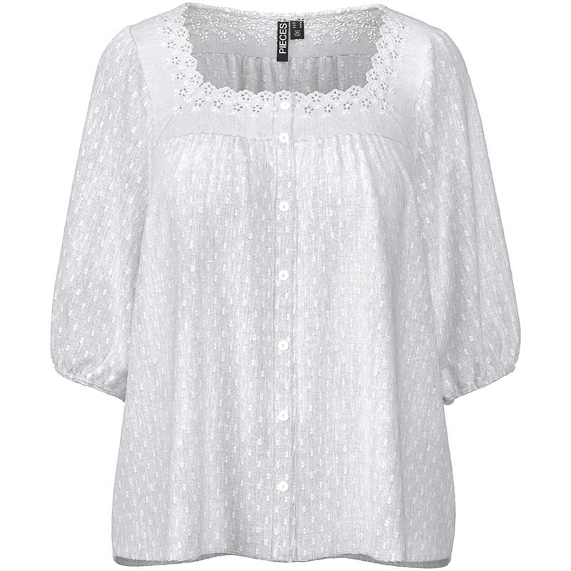 Skøn let bluse fra Pieces i ren bomuld. Blusen har en løs pasform og fine flæsedetaljer ved halsudskæring.