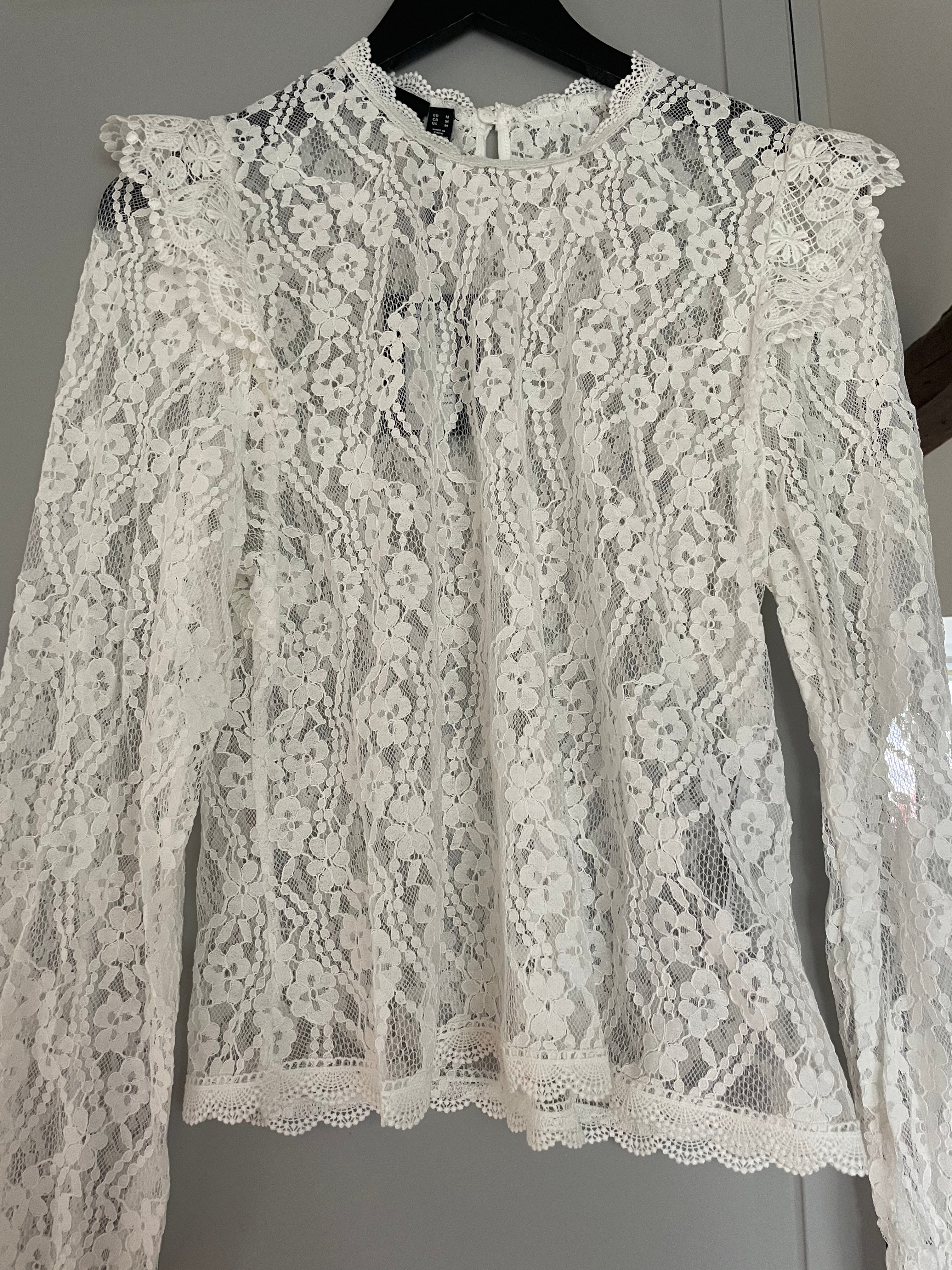 Fin bluse fra Pieces i hvid blonde. Blusen har rund hals og lange ærmer med en fin detalje ved skulderen.