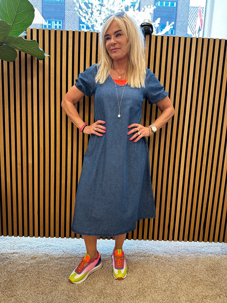 Denim kjole i et fint a-snit med v-udskæring fortil og bagtil. Kvaliteten er i blød denim og er dejlig let.