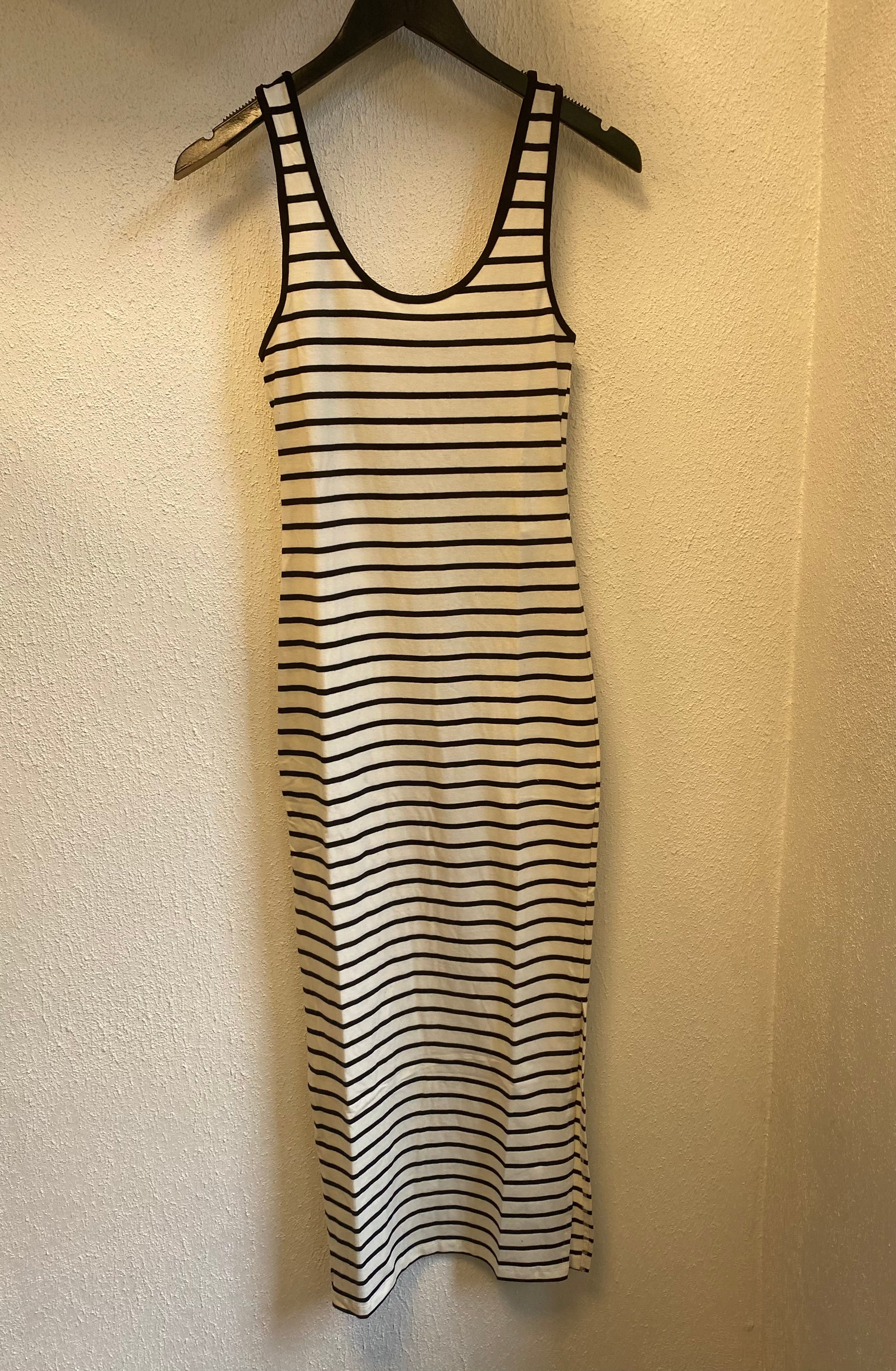Simpel stribet lang kjole fra Pieces. Kjolen er uden ærmer og med rund halsudskæring. Derudover et slids i begge sider.