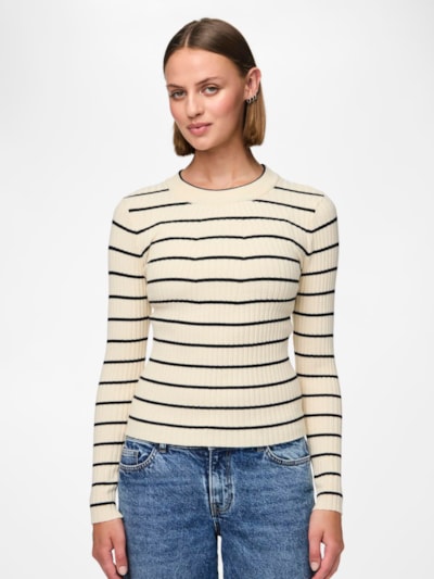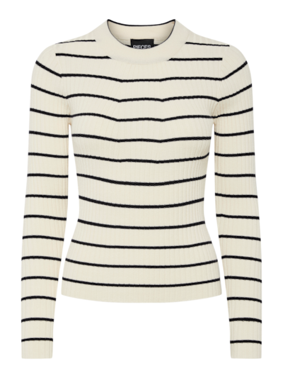 Skøn, blød ribbet strikbluse fra Pieces. Pasform er slim-fit med rund halsudskæring, lange ærmer, og med masser af stretch.