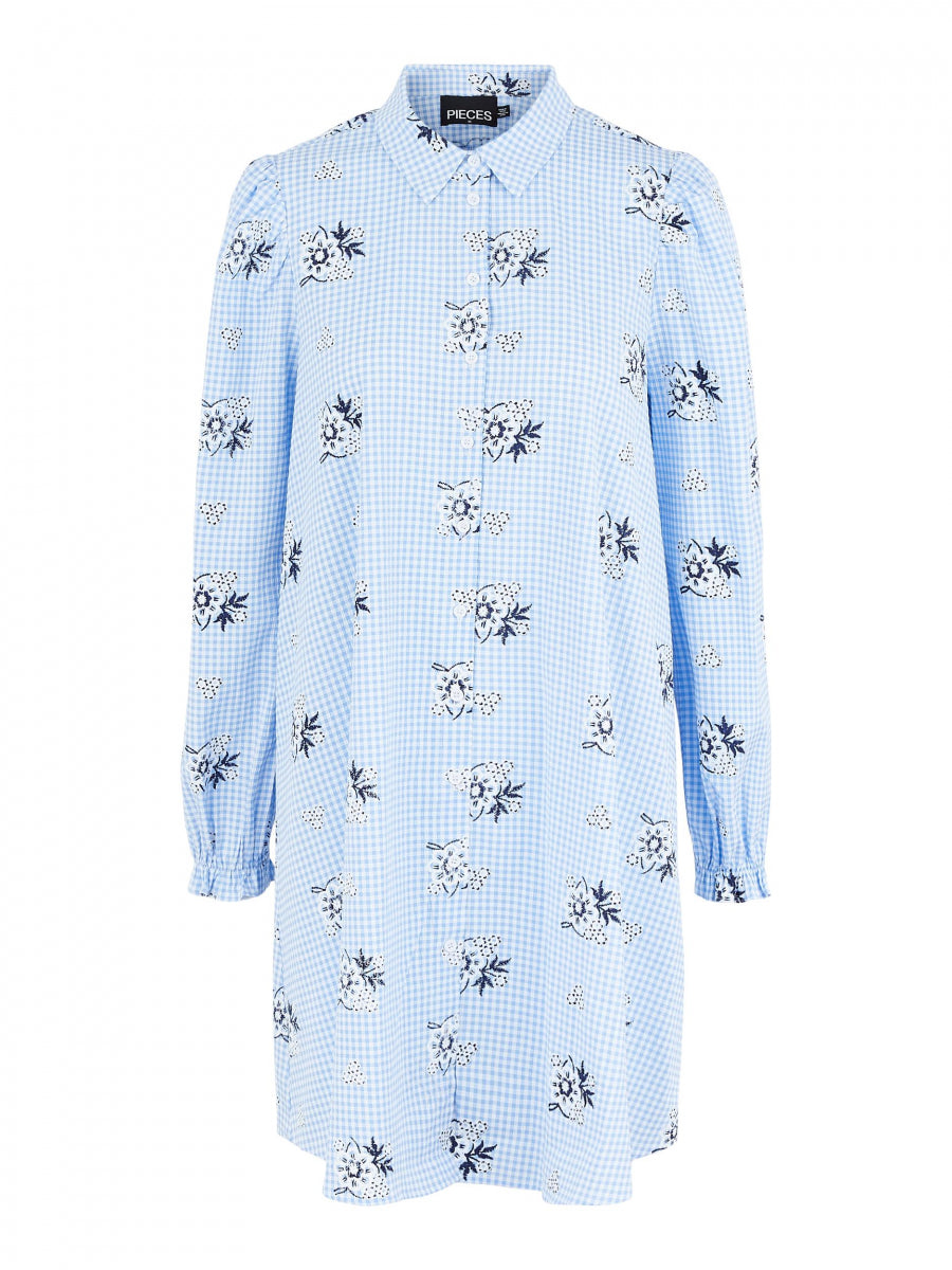 Smuk ternet skjorte kjole i blå og hvide tern med blomster print fra Pieces. Har let rynke detalje ved skylderen og elastikkant ved håndledet. Lukkes hele vejen ned fortil med knapper.