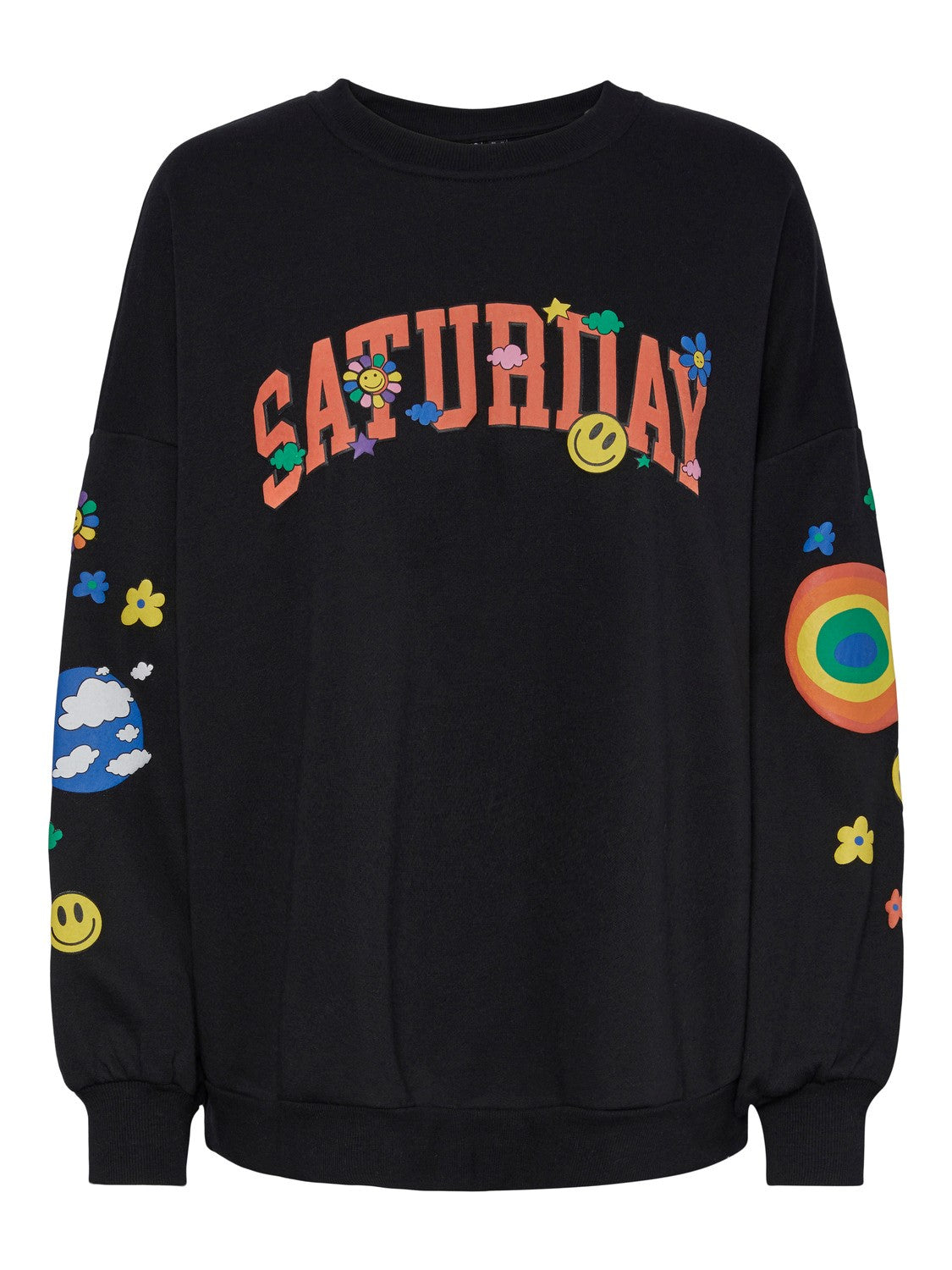 Cool oversize sweater fra Pieces i sort med et farverigt print. Sweateren har lange ærmer med rib og rund halsudskæring.