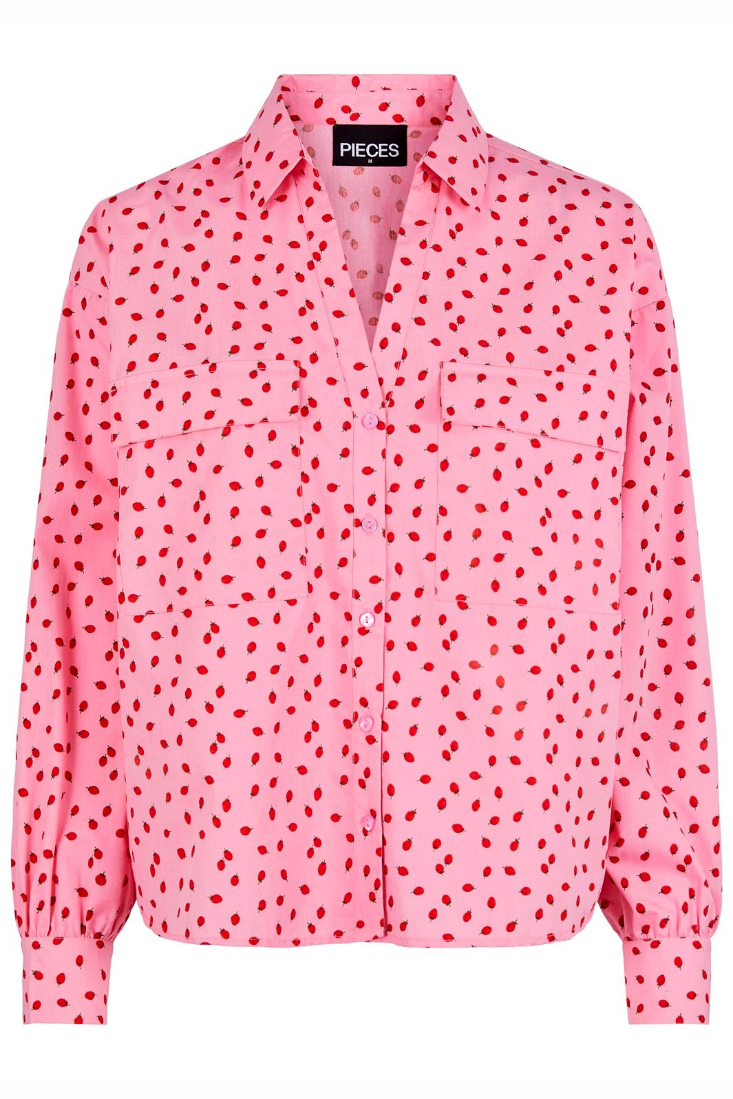 Lækker skjorte fra Pieces i pink med fint jordbær print. Skjorten lukkes med knapper ned foran samt knapper forenden af ærmerne. Fin krave i halsen og V-udskæring. Der er store brystlommer.